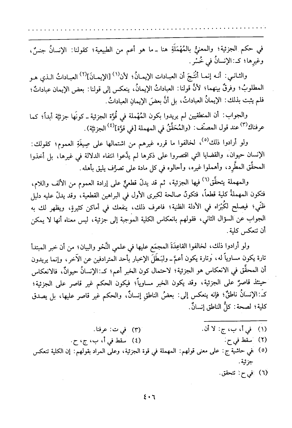 والمهملة يتَحَقَّق فِيهَا الْجُزْئِيَّة، ثمَّ قد يدل قَطْعِيّ على إِرَادَة الْعُمُوم من الْألف وَاللَّام، فَتكون الْمُهْملَة كُلية قطعا، فَتكون صَالِحَة لكبرى الأول فِي الْبَرَاهِين القطعية، وَقد يدل عَلَيْهِ دَلِيل ظَنِّي؛ فيصلح لكبراه فِي الْأَدِلَّة الظنية؛ فاعرف ذَلِك، ينفعك فِي أَمَاكِن كَثِيرَة، وَيظْهر لَك بِهِ الْجَواب عَن السُّؤَال الثَّانِي، فَقَوْلهم بانعكاس الْكُلية الْمُوجبَة إِلَى جزئية، لَيْسَ مَعْنَاهُ أَنَّهَا لَا يُمكن أَن تنعكس كُلية.