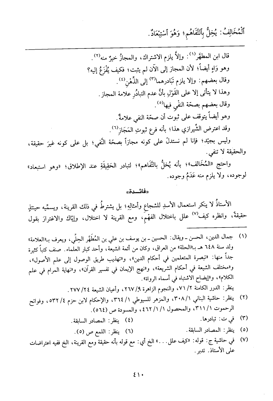 الْأُسْتَاذ لَا يُنكر اسْتِعْمَال الْأسد للشجاع وَأَمْثَاله؛ بل يشْتَرط فِي ذَلِك الْقَرِينَة، ويسميه حِينَئِذٍ حَقِيقَة، وانظره كَيفَ علل باختلال الْفَهم، وَمَعَ الْقَرِينَة لَا اختلال، وَإِيَّاك والاغترار بقول