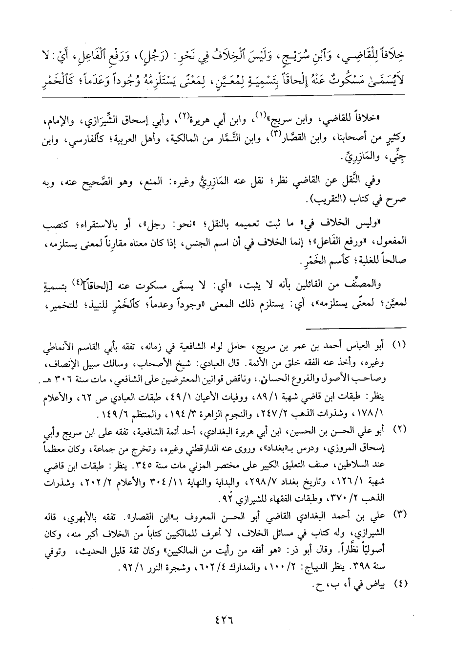 " خلافًا للْقَاضِي، وَابْن سُرَيج "، وَابْن أبي هُرَيْرَة، وَأبي إِسْحَاق الشِّيرَازِيّ، وَالْإِمَام، وَكثير من أَصْحَابنَا، وَابْن الْقصار، وَابْن التمار من الْمَالِكِيَّة، وَأهل الْعَرَبيَّة؛ كالفارسي، وَابْن جني، والمازري.
