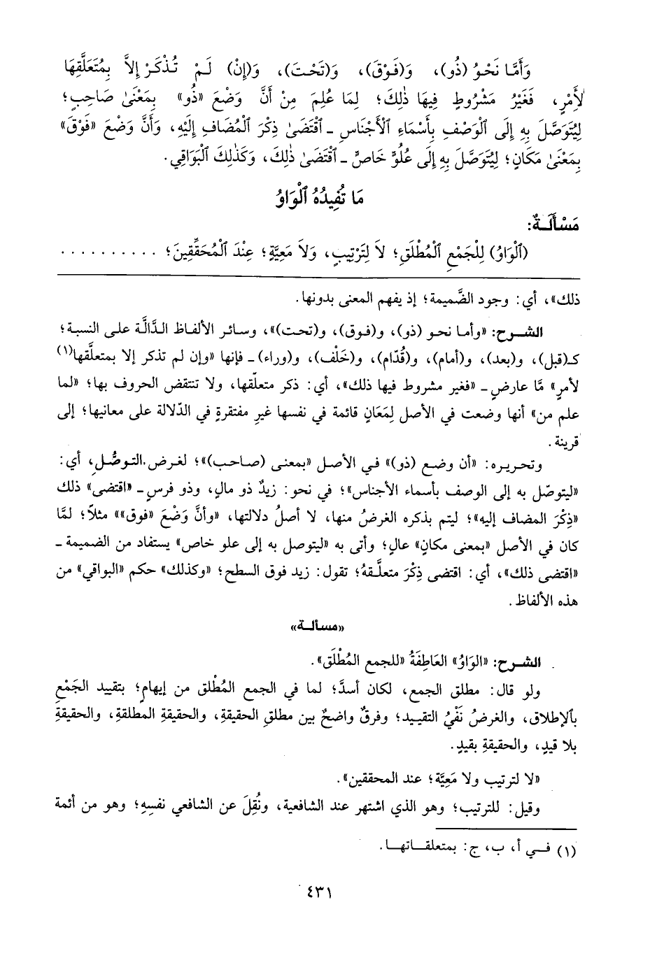 (الْوَاو) للْجمع الْمُطلق؛ لَا لترتيب، وَلَا معية؛ عِنْد الْمُحَقِّقين؛ ... ... ... ...