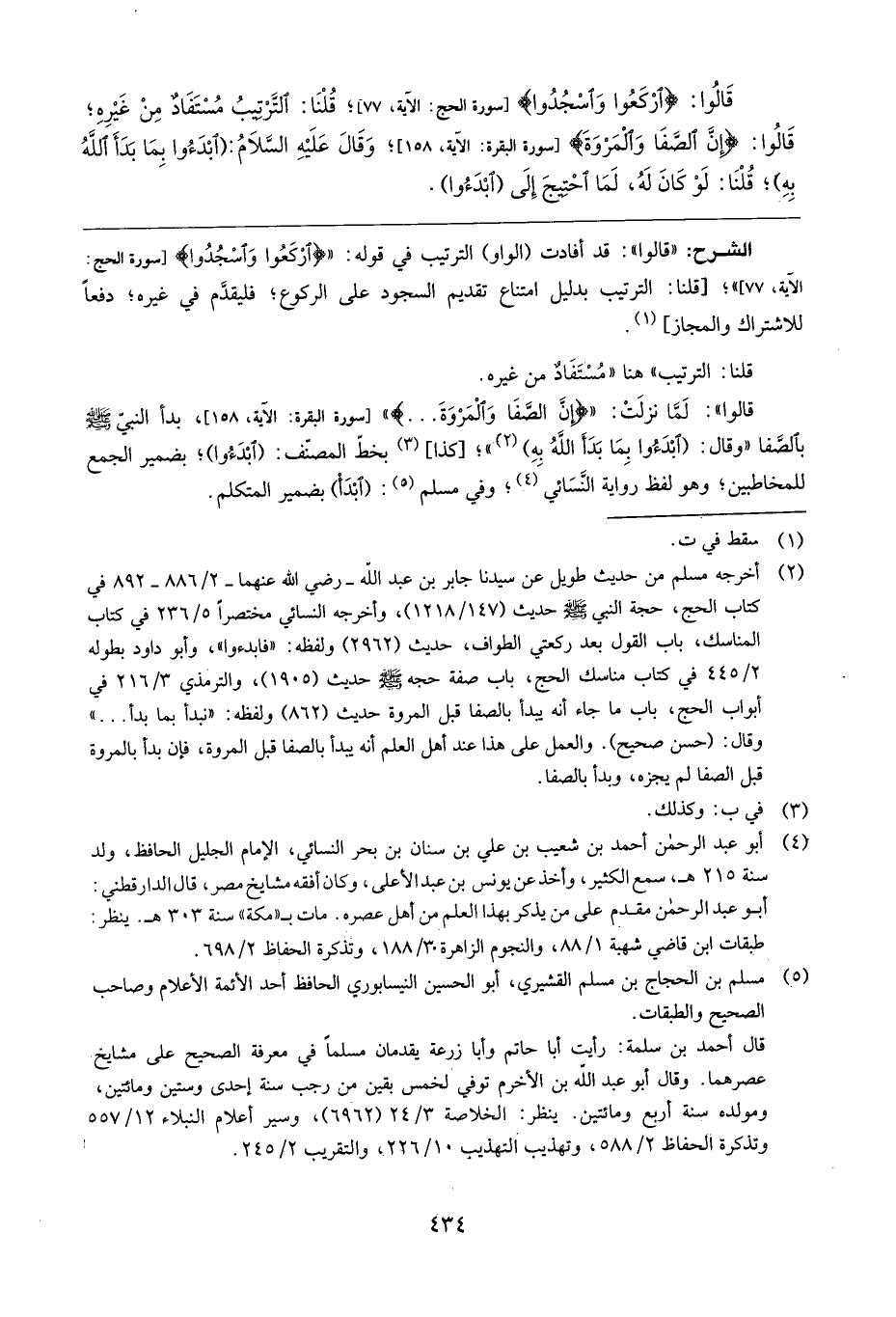 قَالُوا ": لما نزلت: " {إِن الصَّفَا والمروة} " [سُورَة الْبَقَرَة: الْآيَة، 158] ، بَدَأَ النَّبِي - صَلَّى اللَّهُ عَلَيْهِ وَسَلَّم َ - بالصفا " وَقَالَ: (ابدءوا بِمَا بَدَأَ الله بِهِ) "؛ [كَذَا] بِخَط المُصَنّف: (ابدءوا) ؛ بضمير الْجمع للمخاطبين؛ وَهُوَ لفظ رِوَايَة النَّسَائِيّ؛ وَفِي مُسلم: (ابدأ) بضمير الْمُتَكَلّم.