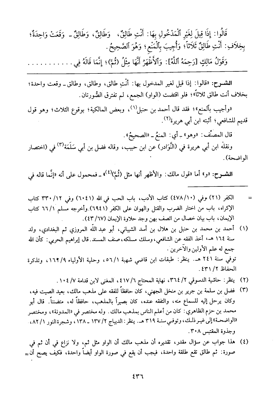 الشَّرْح: " و " أما " قَول مَالك: وَالْأَظْهَر أَنَّهَا مثل (ثمَّ) " - فَمَحْمُول على أَنه " إِنَّمَا قَالَه فِي