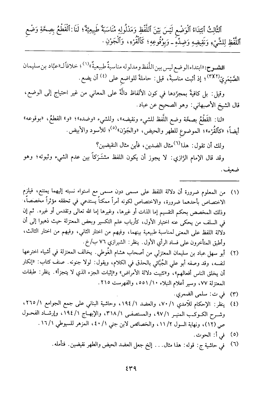 الشَّرْح: " ابْتِدَاء الْوَضع لَيْسَ بَين اللَّفْظ ومدلوله مُنَاسبَة طبيعية "؛ خلافًا ل " عباد بن سُلَيْمَان الصَّيْمَرِيّ؛ إِذْ أثبت مُنَاسبَة، قيل: حاملة للواضع على أَن يضع.