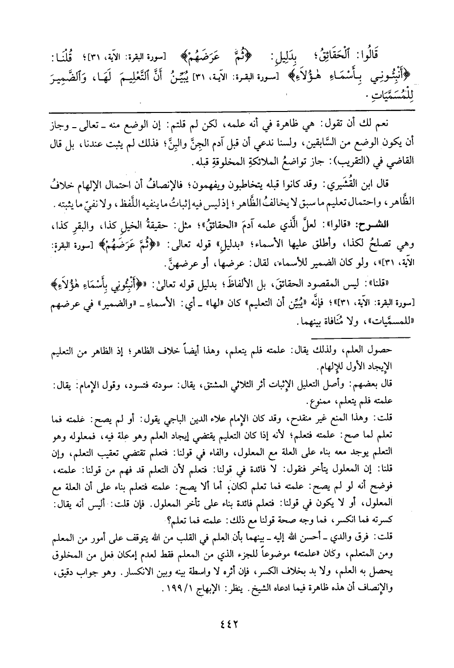 الشَّرْح: " قَالُوا ": لَعَلَّ الَّذِي علمه آدم " الْحَقَائِق "؛ مثل: حَقِيقَة الْخَيل كَذَا، وَالْبَقر كَذَا، وَهِي تصلح لكذا، وَأطلق عَلَيْهَا الْأَسْمَاء؛ " بِدَلِيل " قَوْله تَعَالَى: " {ثمَّ عرضهمْ} [سُورَة الْبَقَرَة: الْآيَة، 31] "، وَلَو كَانَ الضَّمِير للأسماء، لقَالَ: عرضهَا، أَو عرضهن.