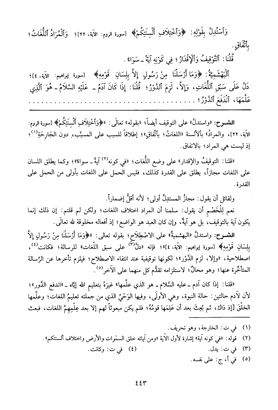 الشَّرْح: وَاسْتدلَّ " البهشمية " على الِاصْطِلَاح؛ بقوله تَعَالَى: " {وَمَا أرسلنَا من رَسُول إِلَّا بِلِسَان قومه} [سُورَة إِبْرَاهِيم: الْآيَة، 4] "؛ فَإِنَّهُ " دلّ على سبق اللُّغَات " للرسالة؛ فَكَانَت، اصطلاحية، " وَإِلَّا، لزم الدّور "؛ لكَونهَا توقيفية عِنْد انْتِفَاء الِاصْطِلَاح؛ فَيلْزم تأخرها عَن الرسَالَة الْمُتَأَخِّرَة عَنْهَا، وَهُوَ محَال؛ لاستلزامه تقدم كل مِنْهُمَا على الآخر.