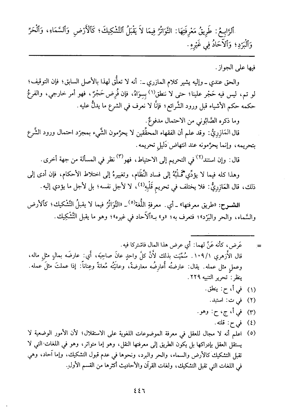 الرَّابِع: طَرِيق مَعْرفَتهَا: التَّوَاتُر فِيمَا لَا يقبل التشكيك؛ كالأرض وَالسَّمَاء، وَالْحر وَالْبرد؛ والآحاد فِي غَيره.