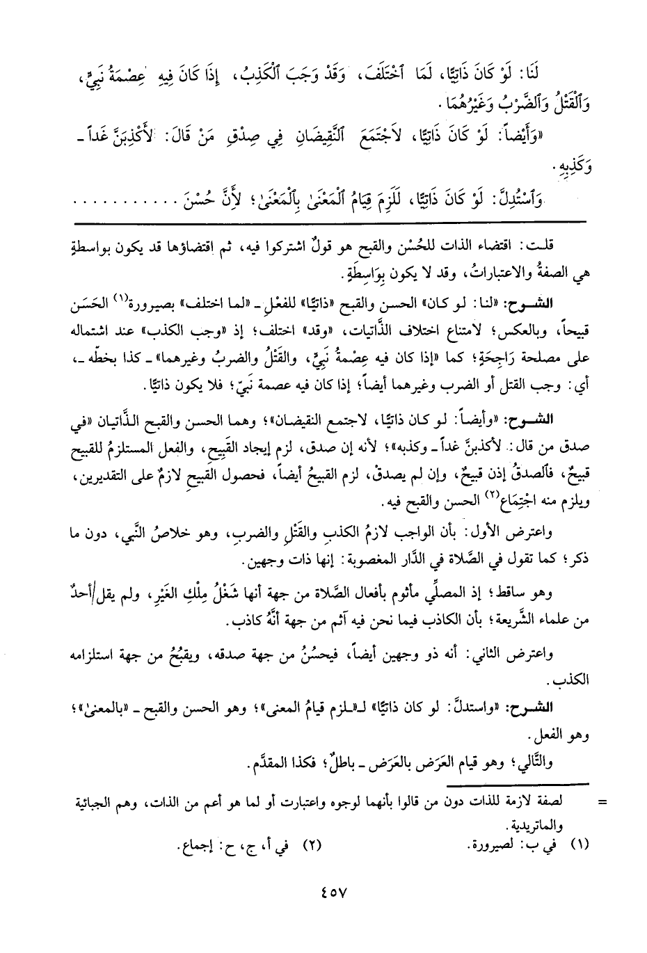 الشَّرْح: " وَأَيْضًا: لَو كَانَ ذاتيا، لاجتمع النقيضان "؛ وهما الْحسن والقبح الذاتيان " فِي صدق من قَالَ: لأكذبن غَدا - وَكذبه "؛ لِأَنَّهُ إِن صدق، لزم إِيجَاد الْقَبِيح، وَالْفِعْل المستلزم للقبيح قَبِيح، فالصدق إِذن قَبِيح، وَإِن لم يصدق، لزم الْقَبِيح أَيْضا، فحصول الْقَبِيح لَازم على التَّقْدِيرَيْنِ، وَيلْزم مِنْهُ اجْتِمَاع الْحسن والقبح فِيهِ.