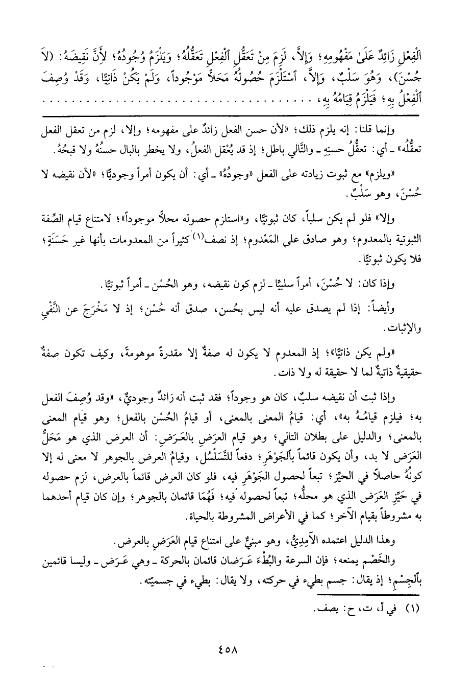 وَإِذا ثَبت أَن نقيضه سلب، كَانَ هُوَ وجودا؛ فقد ثَبت أَنه زَائِد وجودي، " وَقد وصف الْفِعْل بِهِ؛ فَيلْزم قِيَامه بِهِ "، أَي: قيام الْمَعْنى بِالْمَعْنَى، أَو قيام الْحسن بِالْفِعْلِ؛ وَهُوَ قيام الْمَعْنى بِالْمَعْنَى؛ وَالدَّلِيل على بطلَان التَّالِي؛ وَهُوَ قيام الْعرض بِالْعرضِ: أَن الْعرض الَّذِي هُوَ مَحل الْعرض لَا بُد، وَأَن يكون قَائِما بالجوهر؛ دفعا للتسلسل، وَقيام الْعرض بالجوهر لَا معنى لَهُ إِلَّا كَونه حَاصِلا فِي الحيز؛ تبعا لحُصُول الْجَوْهَر فِيهِ، فَلَو كَانَ الْعرض قَائِما بِالْعرضِ، لزم حُصُوله فِي حيّز الْعرض الَّذِي هُوَ مَحَله؛ تبعا لحصوله فِيهِ؛ فهما قائمان بالجوهر؛ وَإِن كَانَ قيام أَحدهمَا بِهِ مَشْرُوطًا بِقِيَام الآخر؛ كَمَا فِي الْأَعْرَاض الْمَشْرُوطَة بِالْحَيَاةِ.