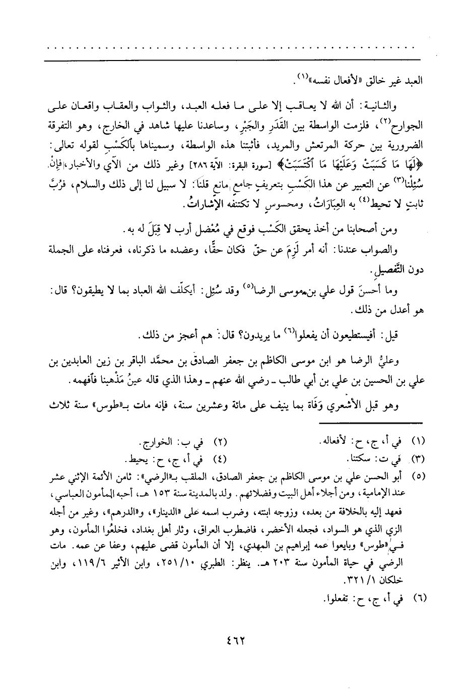 وَالثَّانيَِة: أَن الله لَا يُعَاقب إِلَّا على مَا فعله العَبْد، وَالثَّوَاب وَالْعِقَاب واقعان على الْجَوَارِح، فلزمت الْوَاسِطَة بَين الْقدر والجبر، وساعدنا عَلَيْهَا شَاهد فِي الْخَارِج، وَهُوَ التَّفْرِقَة الضرورية بَين حَرَكَة المرتعش والمريد، فأثبتنا هَذِه الْوَاسِطَة، وسميناها بِالْكَسْبِ لقَوْله تَعَالَى: {لَهَا مَا كسبت وَعَلَيْهَا مَا اكْتسبت} [سُورَة الْبَقَرَة: الْآيَة 286] وَغير ذَلِك من الْآي وَالْأَخْبَار، فَإِن سئلنا عَن التَّعْبِير عَن هَذَا الْكسْب بتعريف جَامع مَانع قُلْنَا: لَا سَبِيل لنا إِلَى ذَلِك وَالسَّلَام، فَرب ثَابت لَا تحيط بِهِ الْعبارَات، ومحسوس لَا تكتنفه الإشارات.