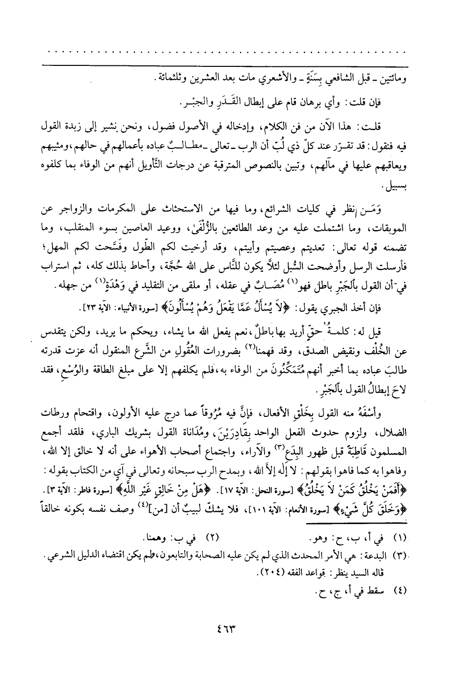 قيل لَهُ: كلمة حق أُرِيد بهَا بَاطِل، نعم يفعل الله مَا يَشَاء، وَيحكم مَا يُرِيد، وَلَكِن يتقدس عَن الْخلف ونقيض الصدْق، وَقد فهمنا بضرورات الْعُقُول من الشَّرْع الْمَنْقُول أَنه عزت قدرته طَالب عباده بِمَا أخبر أَنهم متمكنون من الْوَفَاء بِهِ، فَلم يكلفهم إِلَّا على مبلغ الطَّاقَة والوسع، فقد لَاحَ إبِْطَال القَوْل بالجبر.