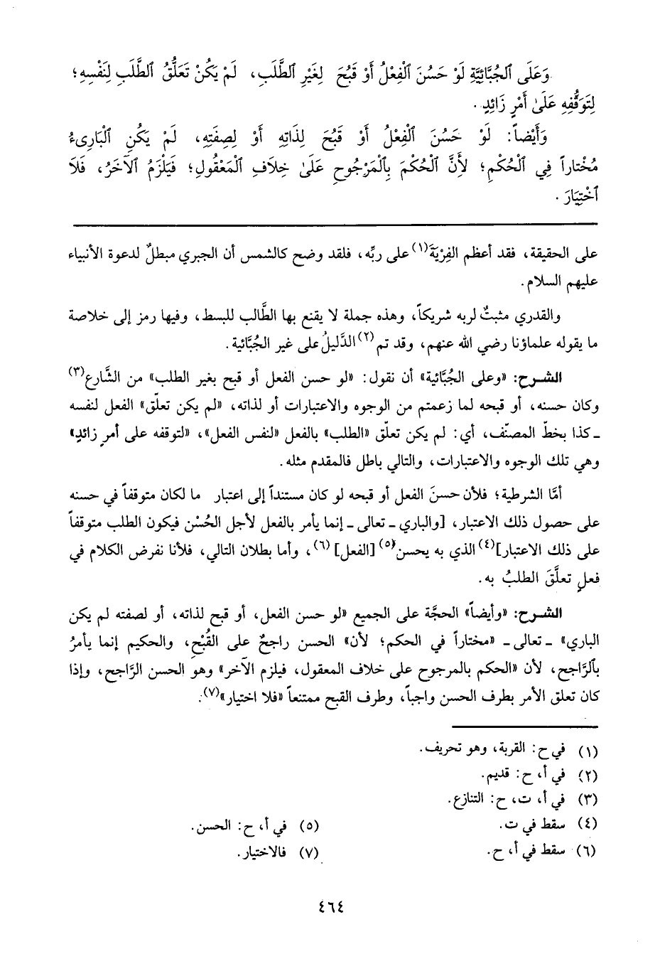 والقدري مُثبت لرَبه شَرِيكا، وَهَذِه جملَة لَا يقنع بهَا الطَّالِب للبسط، وفيهَا رمز إِلَى خُلَاصَة مَا يَقُوله عُلَمَاؤُنَا رَضِي الله عَنْهُم، وَقد تمّ الدَّلِيل على غير الجبائية.