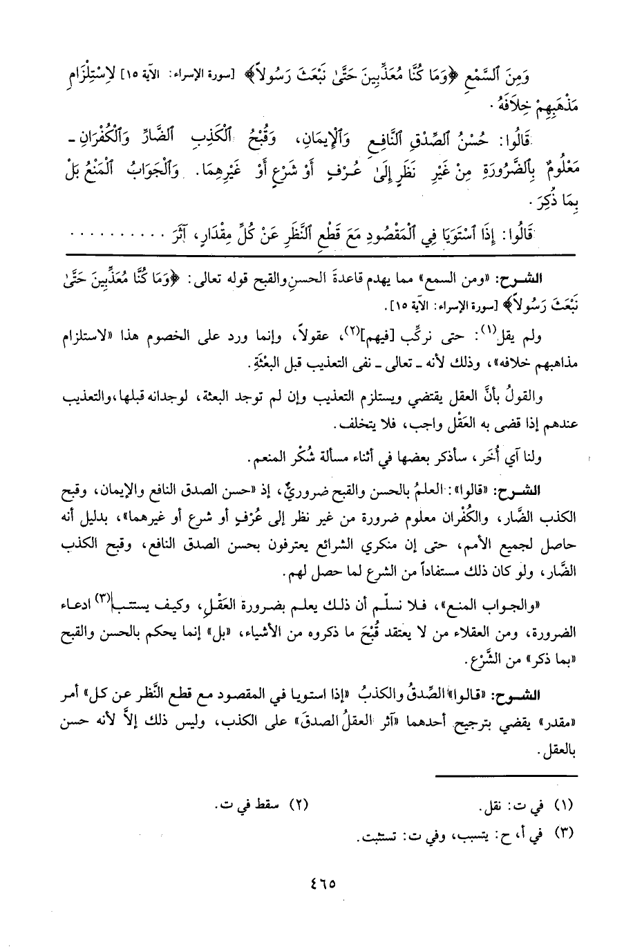 الشَّرْح: " قَالُوا ": الْعلم بالْحسنِ والقبح ضَرُورِيّ، إِذْ " حسن الصدْق النافع وَالْإِيمَان، وقبح الْكَذِب الضار، والكفران مَعْلُوم ضَرُورَة من غير نظر إِلَى عرف أَو شرع أَو غَيرهمَا "، بِدَلِيل أَنه حَاصِل لجَمِيع الْأُمَم، حَتَّى إِن منكري الشَّرَائِع يعترفون بِحسن الصدْق النافع، وقبح الْكَذِب الضار، وَلَو كَانَ ذَلِك مستفادا من الشَّرْع لما حصل لَهُم.