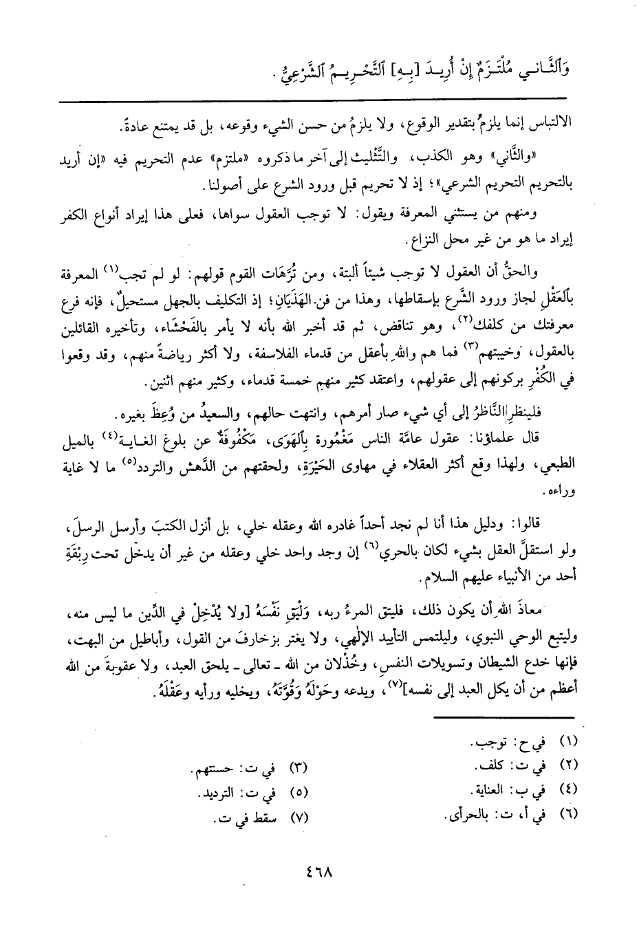 وَالْحق أَن الْعُقُول لَا توجب شَيْئا أَلْبَتَّة، وَمن ترهات الْقَوْم قَوْلهم: لَو لم تجب الْمعرفَة بِالْعقلِ لجَاز وُرُود الشَّرْع بإسقاطها، وَهَذَا من فن الهذيان؛ إِذْ التَّكْلِيف بِالْجَهْلِ مُسْتَحِيل، فَإِنَّهُ فرع معرفتك من كلفك، وَهُوَ تنَاقض، ثمَّ قد أخبر الله بِأَنَّهُ لَا يَأْمر بالفحشاء، وتأخيره الْقَائِلين بالعقول، وخيبتهم فَمَا هم وَالله بأعقل من قدماء الفلاسفة، وَلَا أَكثر رياضة مِنْهُم، وَقد وَقَعُوا فِي الْكفْر بركونهم إِلَى عُقُولهمْ، واعتقد كثير مِنْهُم خَمْسَة قدماء، وَكثير مِنْهُم اثْنَيْنِ.