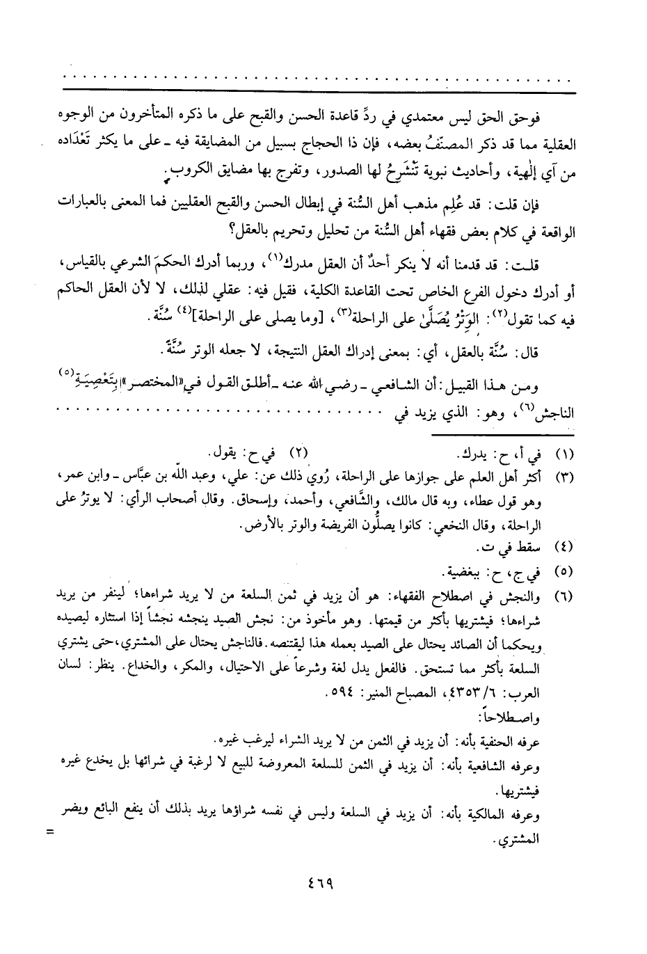 فَإِن قلت: قد علم مَذْهَب أهل السّنة فِي إبِْطَال الْحسن والقبح العقليين فَمَا الْمَعْنى بالعبارات الْوَاقِعَة فِي كَلَام بعض فُقَهَاء أهل السّنة من تَحْلِيل وَتَحْرِيم بِالْعقلِ؟