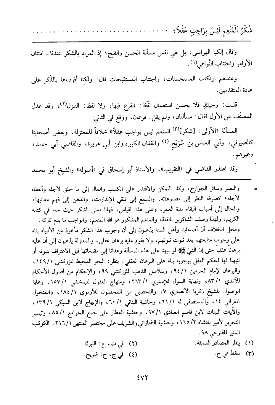 وَقَالَ إِلْكيَا الهراسي: بل هِيَ نفس مَسْأَلَة الْحسن والقبح؛ إِذْ المُرَاد بالشكر عندنَا - امْتِثَال الْأَوَامِر وَاجْتنَاب النواهي.