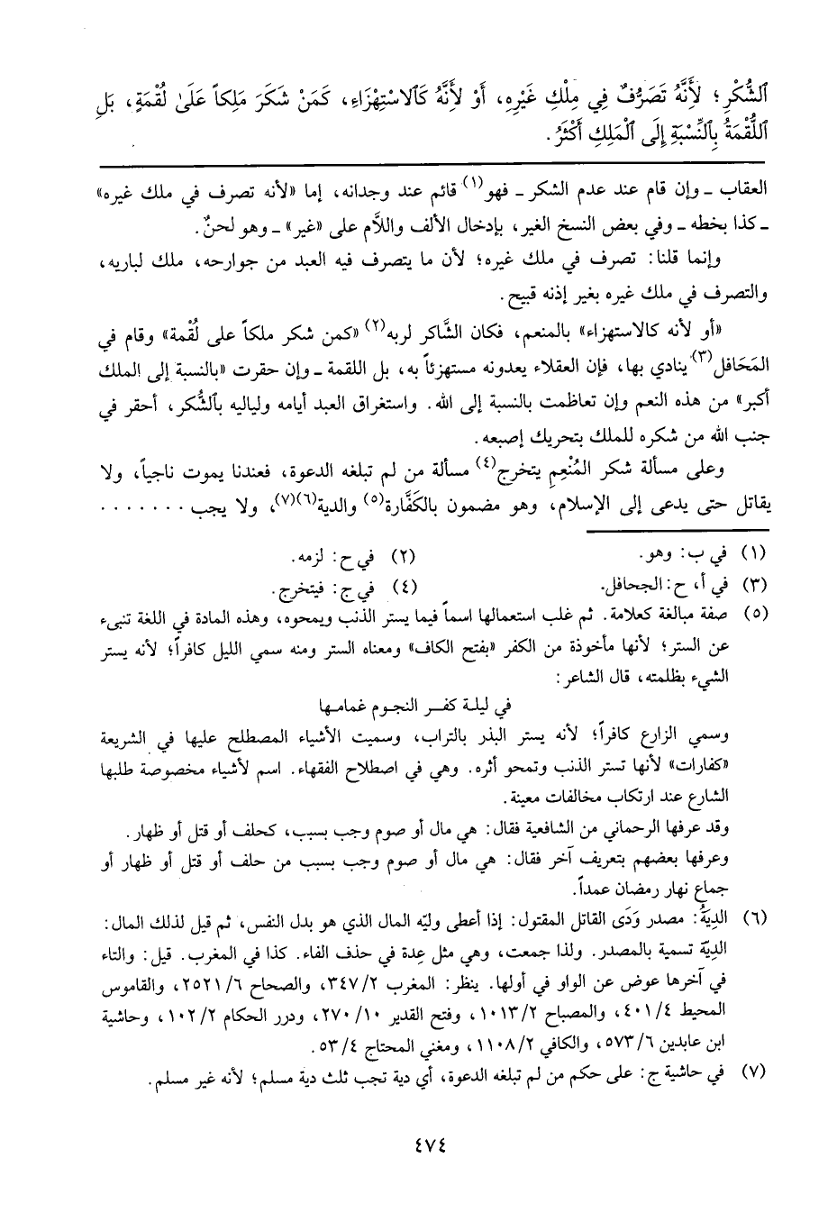 هَامِش الْعقَاب - وَإِن قَامَ عِنْد عدم الشُّكْر - فَهُوَ قَائِم عِنْد وجدانه، إِمَّا " لِأَنَّهُ تصرف فِي ملك غَيره " - كَذَا بِخَطِّهِ - وَفِي بعض النّسخ الْغَيْر، بِإِدْخَال الْألف وَاللَّام على " غير " - وَهُوَ لحن.