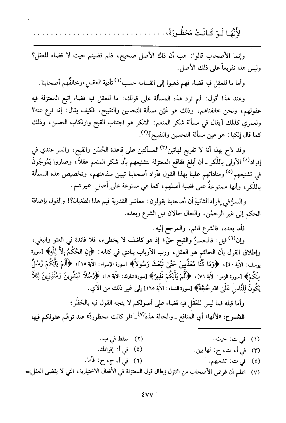 وَعند هَذَا أَقُول: لم ترد هَذِه الْمَسْأَلَة على قَوْلك: مَا لِلْعَقْلِ فِيهِ قَضَاء اتبع الْمُعْتَزلَة فِيهِ عُقُولهمْ، وَنحن خالفناهم، وَذَلِكَ هُوَ عين مَسْأَلَة التحسين والتقبيح، فَكيف يُقَال: إِنَّه فرع عَنهُ؟ ولعمري كَذَلِك [يُقَال فِي مَسْأَلَة شكر الْمُنعم: الشُّكْر هُوَ اجْتِنَاب الْقبْح وارتكاب الْحسن، وَذَلِكَ كَمَا قَالَ إِلْكيَا: هُوَ عين مَسْأَلَة التحسين والتقبيح] .