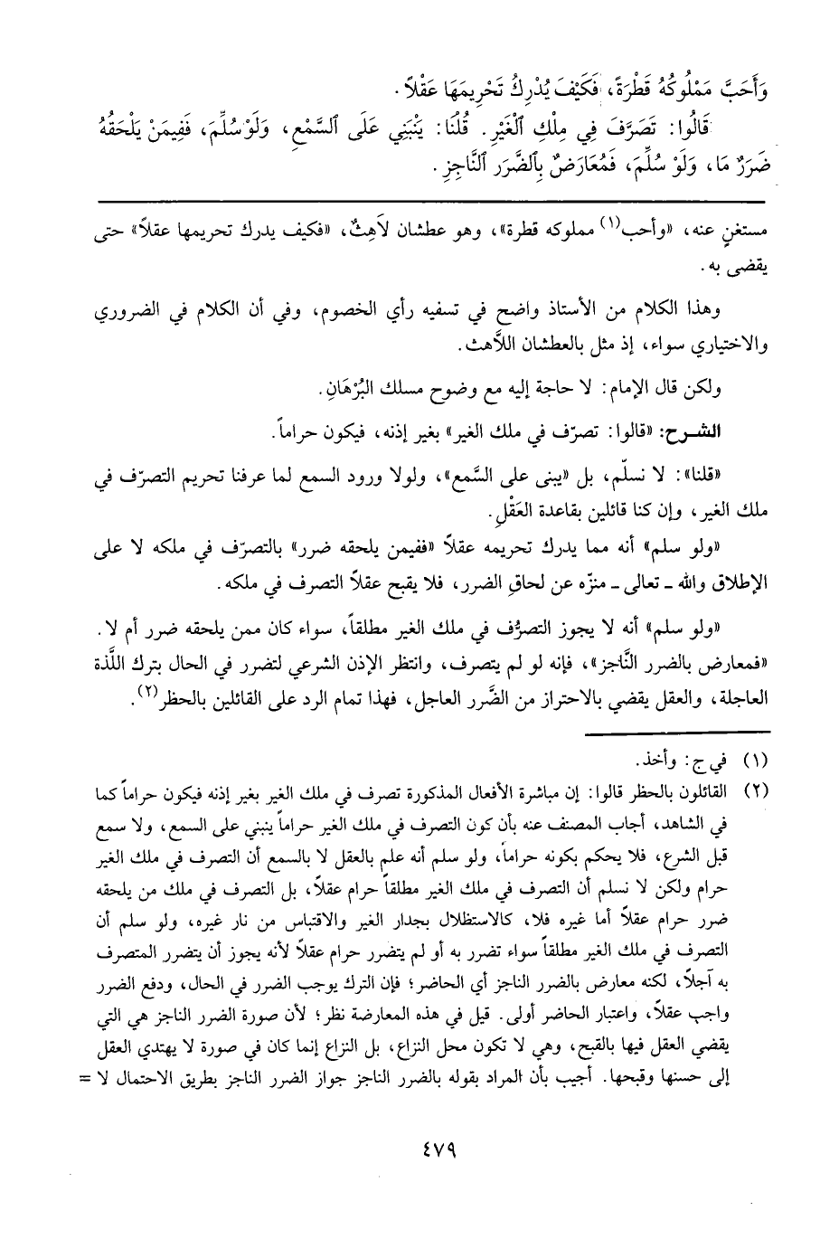 " وَلَو سلم " أَنه لَا يجوز التَّصَرُّف فِي ملك الْغَيْر مُطلقًا، سَوَاء كَانَ مِمَّن يلْحقهُ ضَرَر أم لَا. " فمعارض بِالضَّرَرِ الناجز "، فَإِنَّهُ لَو لم يتَصَرَّف، وانتظر الْإِذْن الشَّرْعِيّ لتضرر فِي الْحَال بترك اللَّذَّة العاجلة، وَالْعقل يقْضِي بالاحتراز من الضَّرَر العاجل، فَهَذَا تَمام الرَّد على الْقَائِلين بالحظر.