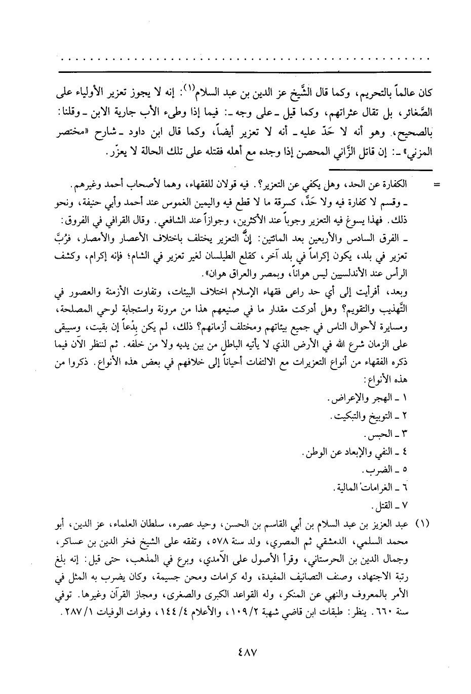 هَامِش كَانَ عَالما بِالتَّحْرِيمِ، وكما قَالَ الشَّيْخ عز الدّين بن عبد السَّلَام: إِنَّه لَا يجوز تَعْزِير الْأَوْلِيَاء على الصَّغَائِر، بل تقال عثراتهم، وكما قيل - على وَجه -: فِيمَا إِذا وطئ الْأَب جَارِيَة الابْن - وَقُلْنَا: بِالصَّحِيحِ، وَهُوَ أَنه لَا حد عَلَيْهِ - أَنه لَا تَعْزِير أَيْضا، وكما قَالَ ابْن دَاوُد - شَارِح " مُخْتَصر الْمُزنِيّ " -: إِن قَاتل الزَّانِي الْمُحصن إِذا وجده مَعَ أَهله فَقتله على تِلْكَ الْحَالة لَا يُعَزّر.