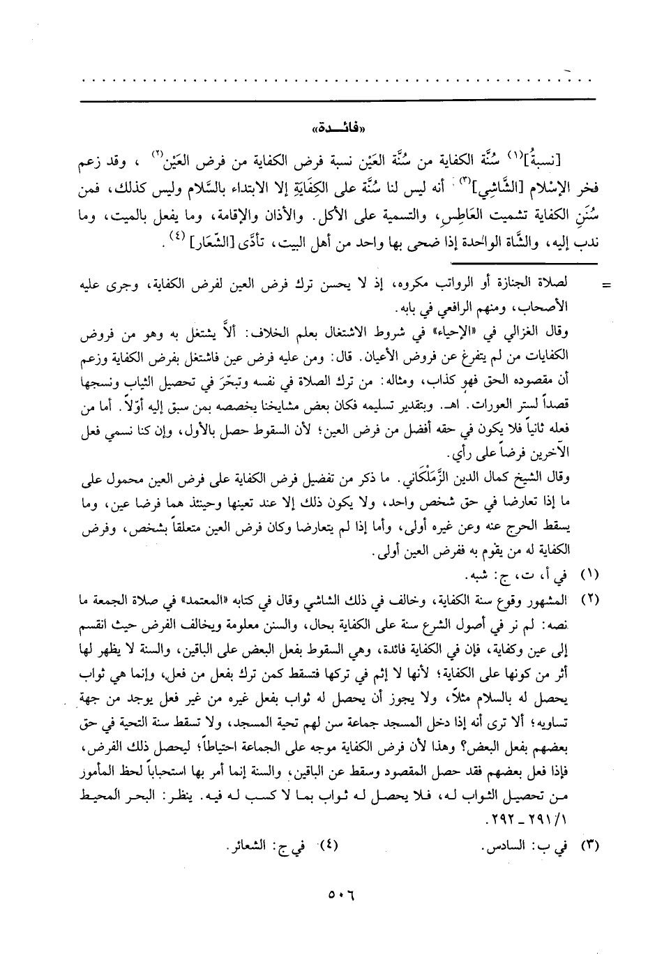 [نِسْبَة] سنة الْكِفَايَة من سنة الْعين نِسْبَة فرض الْكِفَايَة من فرض الْعين، وَقد زعم فَخر الْإِسْلَام [الشَّاشِي] أَنه لَيْسَ لنا سنة على الْكِفَايَة إِلَّا الِابْتِدَاء بِالسَّلَامِ وَلَيْسَ كَذَلِك، فَمن سنَن الْكِفَايَة تشميت الْعَاطِس، وَالتَّسْمِيَة على الْأكل. وَالْأَذَان وَالْإِقَامَة، وَمَا يفعل بِالْمَيتِ، وَمَا ندب إِلَيْهِ، وَالشَّاة الْوَاحِدَة إِذا ضحى بهَا وَاحِد من أهل الْبَيْت، تأدى [الشعار] .