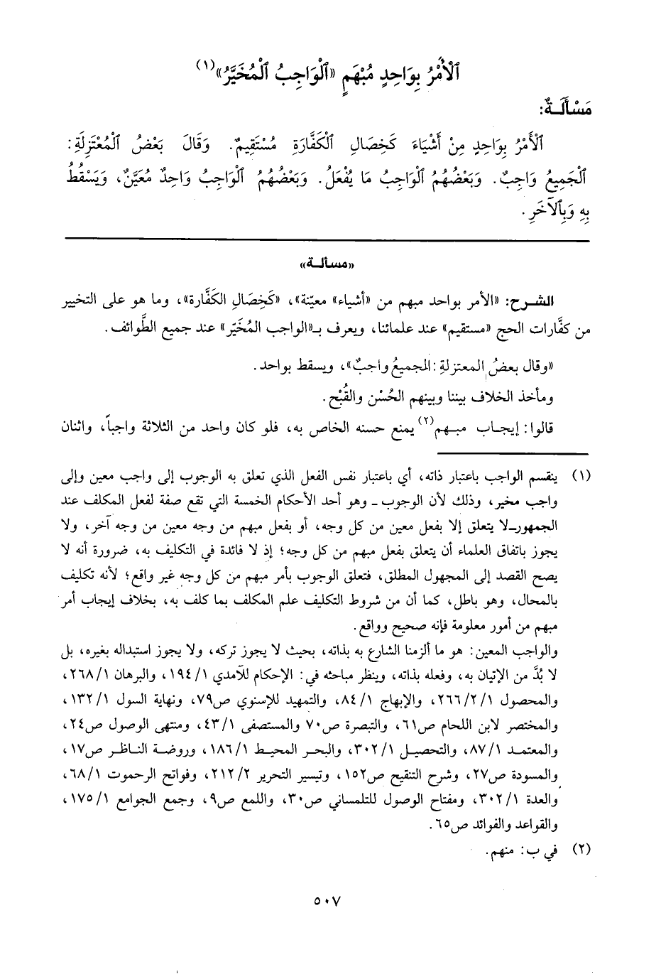 الشَّرْح: " الْأَمر بِوَاحِد مُبْهَم من " أَشْيَاء " مُعينَة "، " كخصال الْكَفَّارَة "، وَمَا هُوَ على التَّخْيِير من كَفَّارَات الْحَج " مُسْتَقِيم " عِنْد عُلَمَائِنَا، وَيعرف ب " الْوَاجِب الْمُخَير " عِنْد جَمِيع الطوائف.