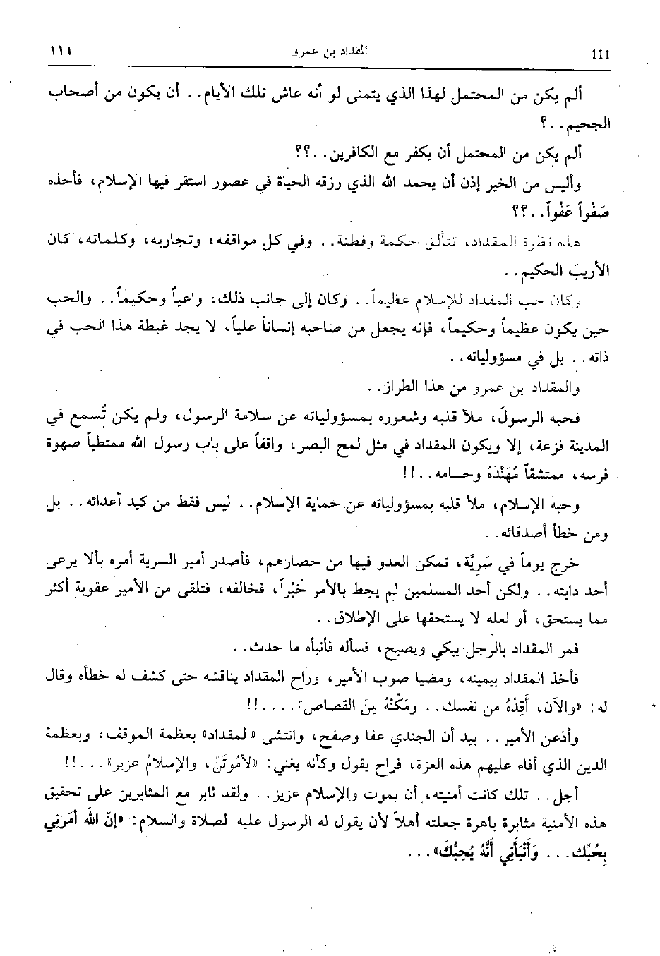 وأذعن الأمير.. بيد أن الجندي عفا وصفح، وانتشى المقداد بعظمة الموقف، وبعظمة الدين الذي أفاء عليهم هذه العزة، فراح يقول وكأنه يغني: