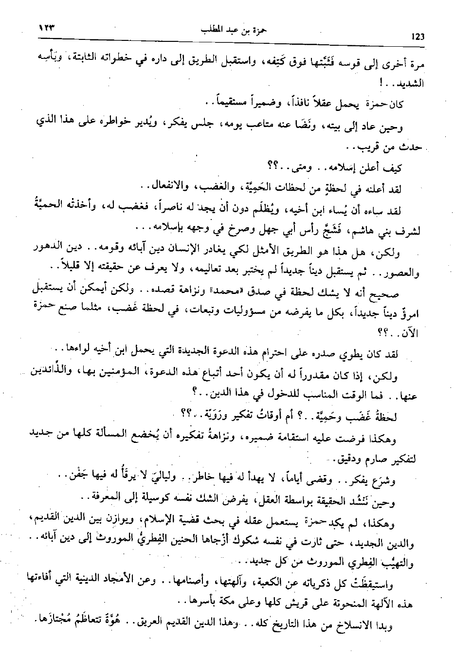 وهكذا، لم يكد حمزة يستعمل في بحث قضية الاسلام، ويوازن بين الدين القديم، والدين الجديد، حتى ثارت في نفسه شكوك أرجاها الحنين الفطري الموروث الى دين آبائه.. والتهيّب الفطري الموروث من كل جيد..