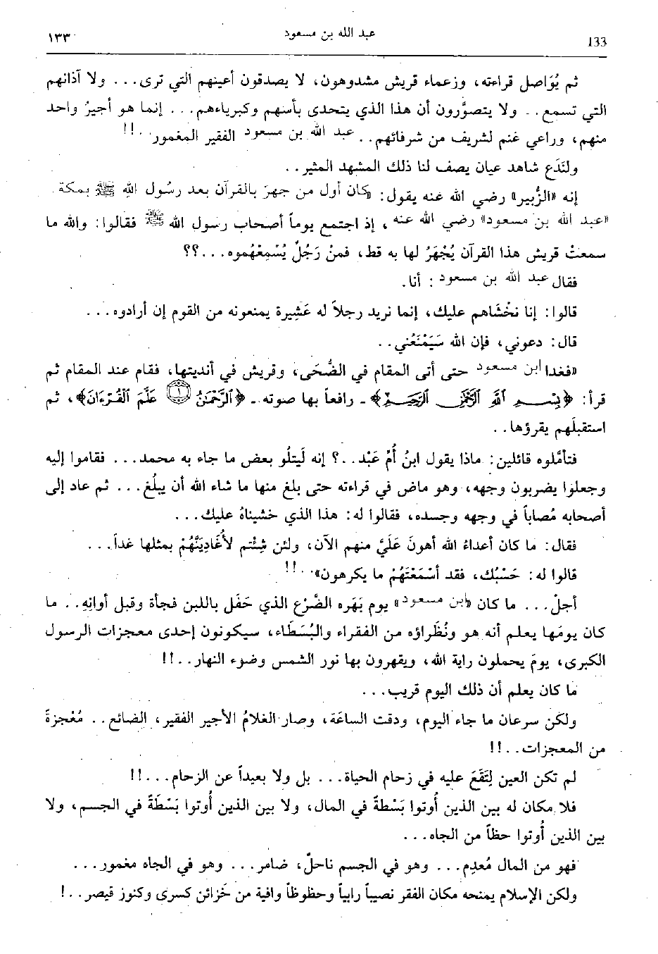 ثم يواصل قراءته. وزعماء قريش مشدوهون، لا يصدقون أعينهم التي ترى.. ولا آذانهم التي تسمع.. ولا يتصورون أن هذا الذي يتحدى بأسهم.. وكبريائهم..انما هو أجير واحد منهم، وراعي غنم لشريف من شرفائهم.. عبد الله بن مسعود الفقير المغمور..!!