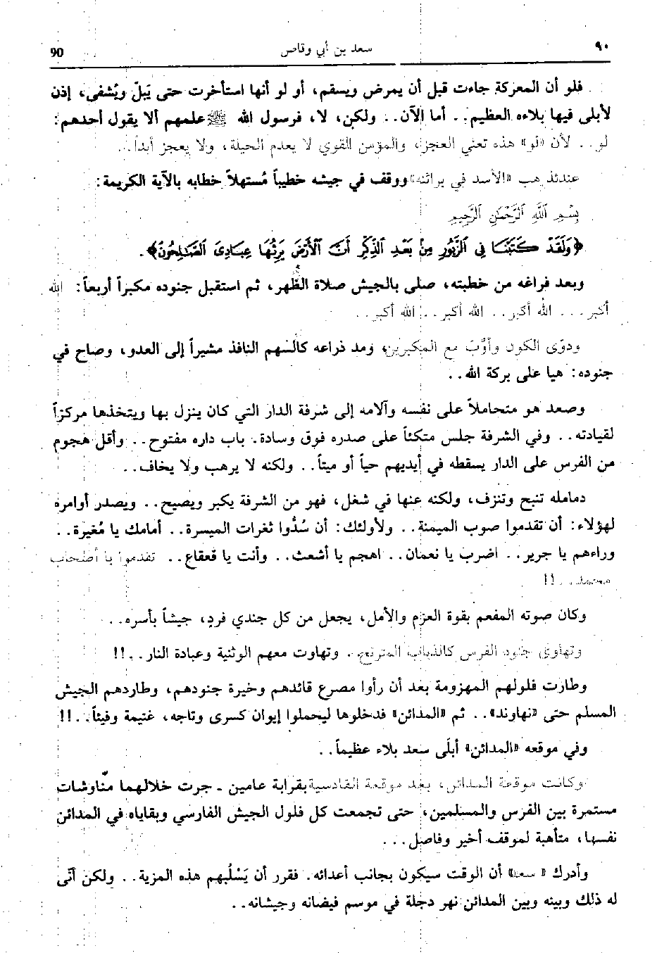 دمامله تنبح وتنزف، ولكنه عنها في شغل، فهو من الشرفة يكبر ويصيح.. ويصدر أوامره لهؤلاء: أن تقدّموا صوب الميمنة.. ولألئك: أن سدوا ثغرات الميسرة.. أمامك يا مغيرة.. وراءهم يا جرير.. اضرب يا نعمان.. اهجم يا أشعث.. وأنت يا قعقاع.. تقدموا يا أصحاب محمد..!!