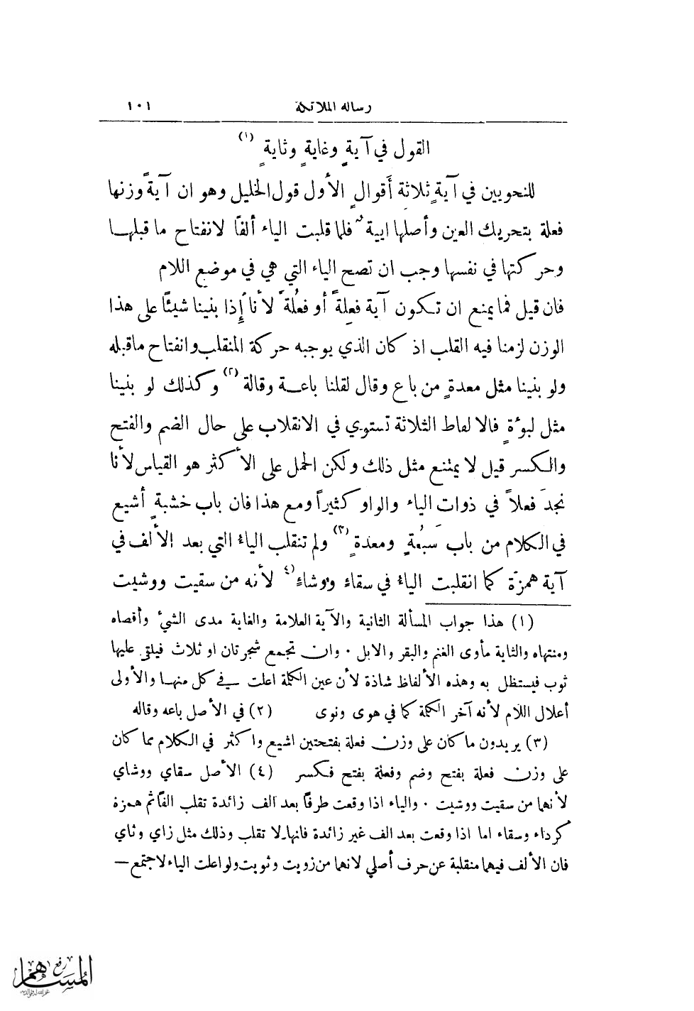 (¬1) هذا جواب المسألة الثانية والآية العلامة والغاية مدى الشيء وأقصاه ومنتهاه والثاية مأوى الغنم والبقر والابل. وأن تجمع شجرتان أو ثلاث فيلقى عليها ثوب فيستظل به وهذه الألفاظ شاذة لأن عين الكلمة اعلت في كل منهما والأولى أعلال اللام لأنه آخر الكلمة كما في هوى ونوى