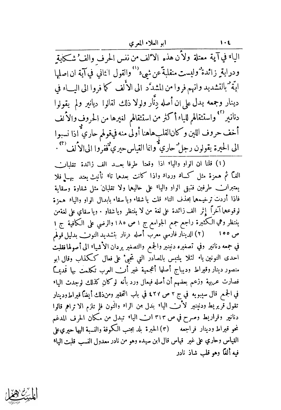 (¬2) الدينار فارسي معرب أصله دنار بتشديد النون بدليل قولهم في جمعه دنانير وفي تصغيره دنينير والجمع والتصغير يردان الأشياء إلى أصولها فقلبت احدى النونين ياء لئلا يلتبس بالمصادر التي تجيء على فعال ككذاب وقال أبو منصور دينار وقيراط وديباج أصلها أعجمية غير أن العرب تكلمت بها قديمًا فصارت عربية وزعم بعضهم أن أصله فيعال ورد بأنه لو كان كذلك لوجدت الياء في الجمع قال سيبويه في ج 2 ص 427 في باب التحقير ومن ذلك أيضًا قيراط ودينار تقول قريريط ودنينير لأن الياء بدل من الراء والنون إلا تراهم قالوا دنانير وقراريط وصرح في ص 313 أن الياء تبدل من مكان الحرف المدغم نحو قيراط ودينار فراجعه