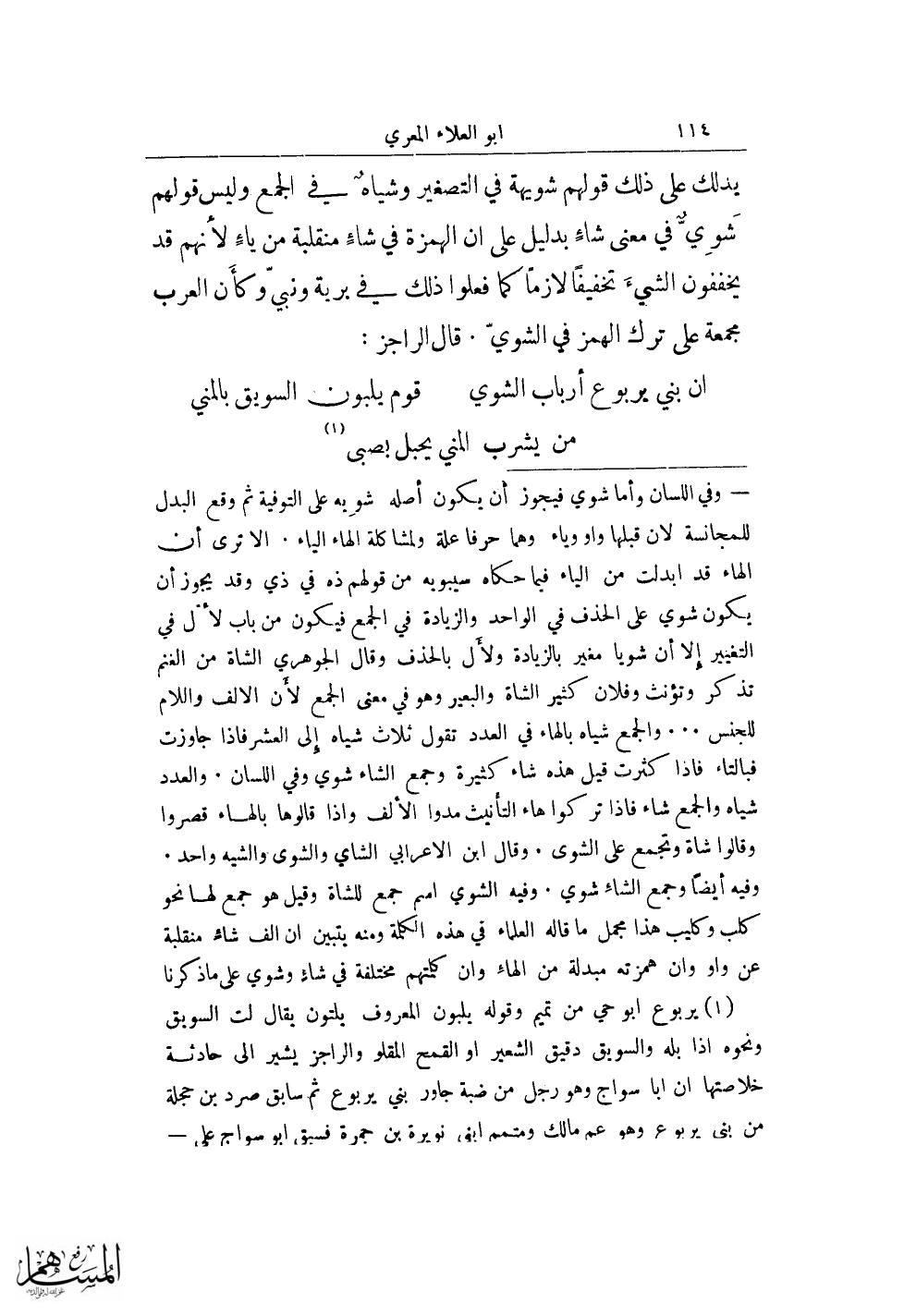 يدلك على ذلك قولهم شويهة في التصغير وشياه في الجمع وليس قولهم شوي في معنى شاءٍ بدليل على أن الهمزة في شاءٍ منقلبة من ياءٍ لأنهم قد يخففون الشيء تخفيفًا لازمًا كما فعلوا ذلك في برية ونبي وكأن العرب مجمعة على ترك الهمز في الشويّ. قال الراجز: