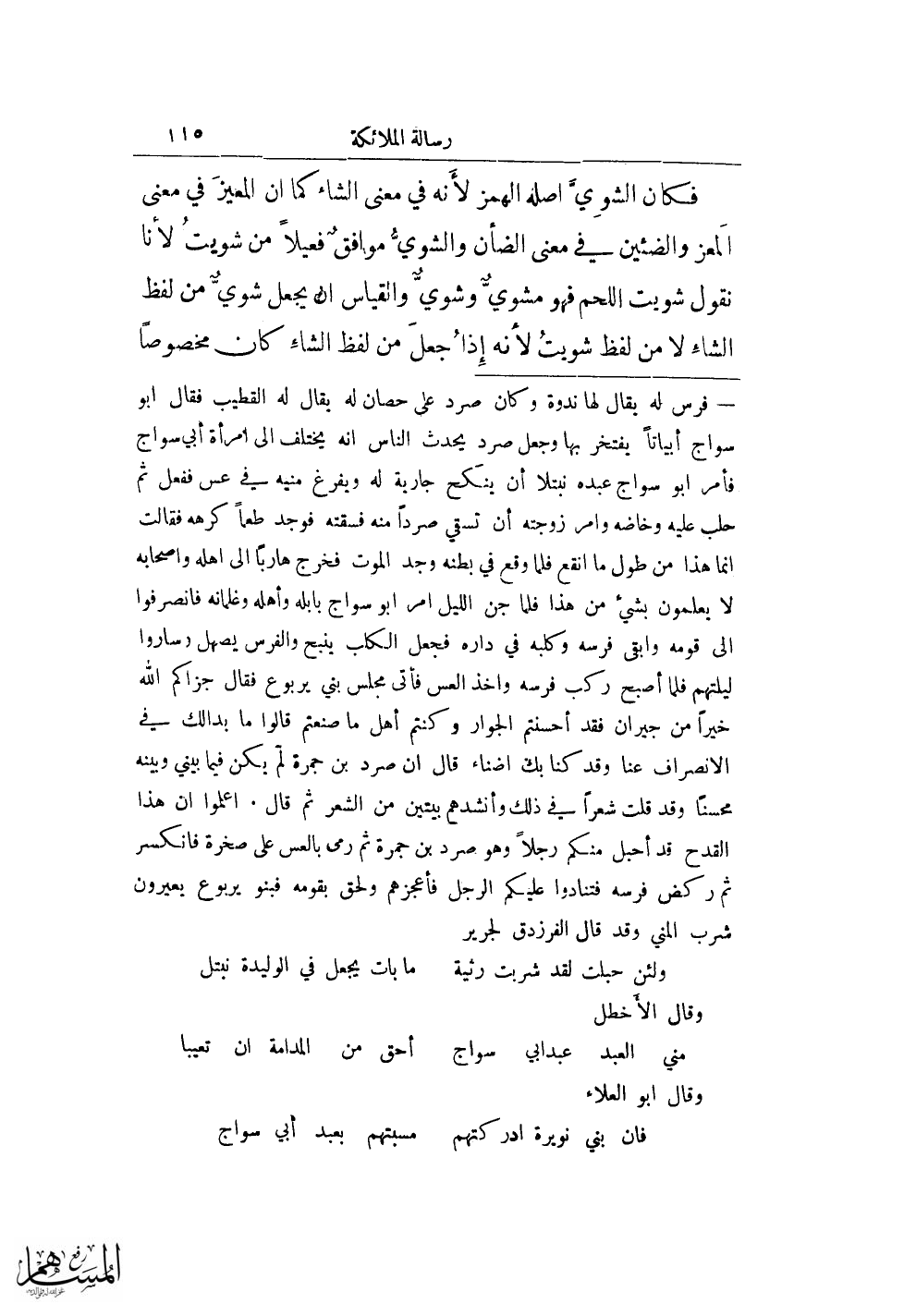 = فرس له يقال لها ندوة وكان صرد على حصان له يقال له القطيب فقاال أبو سواج أبياتًا يفتخر بها وجعل صرد يحدث الناس أنه يختلف إلى امرأة أبي سواج فأمر أبو سواج عبده نبتلا أن ينكح جارية له ويفرغ منيه في عس ففعل ثم حلب عليه وخاضه وأمر زوجته أن تسقي صردًا منه فسقته فوجد طعمًا كرهه فقالت إنما هذا من طول ما انقع فلما وقع في بطنه وجد الموت فخرج هاربًا إلى أهله وأصحابه لا يعلمون بشيء من هذا فلما جن الليل أمر أبو سواج بابله وأهله وغلمانه فانصرفوا إلى قومه وابقى فرسه وكلبه في داره فجعل الكلب يينبح والفرس يصهل (ساروا ليلتهم فلما أصبح ركب فرسه وأخذ العس فأتى مجلس بني يربوع فقال جزاكم الله خيرًا من جيران فقد أحسنتم الجوار وكنتم أهل ما صنعتم قالوا ما بدالك في الانصراف عنا وقد كنا بك اضناء قال أن صرد بن جمرة لم يكن فيما بيني وبينه محسنًا وقد قلت شعرًا في ذلك وأنشدهم بيتين من الشعر ثم قال. اعلموا أن هذا القدح قد أحبل منكم رجلاً وهو صرد بن جمرة ثم رمى بالعس على صخرة فانكسر ثم ركض فرسه فتنادوا عليكم الرجل فأعجزهم ولحق بقومه فبنو يربوع يعيرون شرب المني وقد قال الفرزدق لجرير