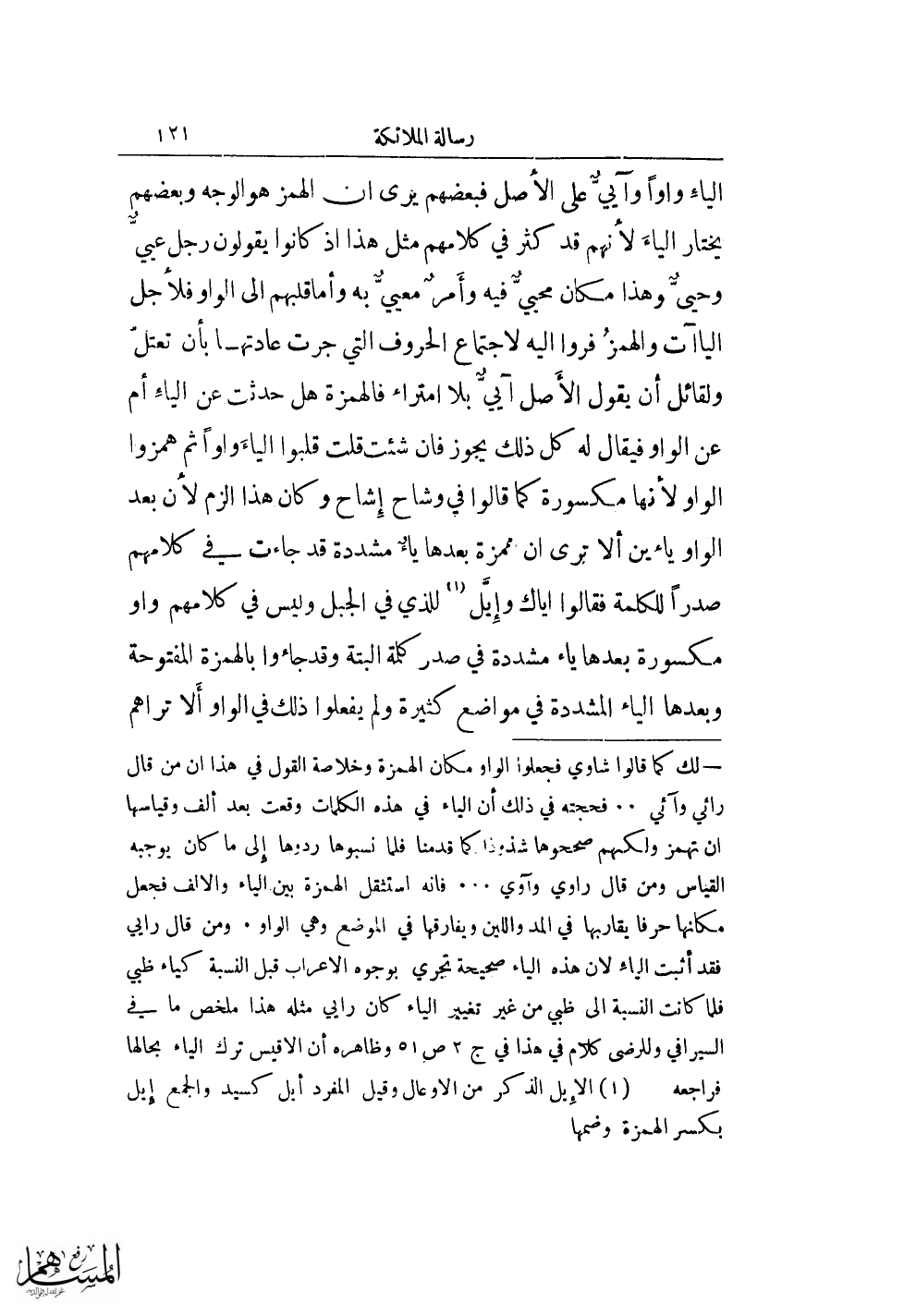 = لك كما قالوا شاوي فجعلوا الواو مكان الهمزة وخلاصة القول في هذا أن من قال رائي وآئي .. فحجته في ذلك أن الياء في هذه الكلمات وقعت بعد ألف وقياسها أن تهمز ولكهم صححوها شذوذا كما قدمنا فلما نسبوها ردوها إلأى ما كان يوجبه القياس ومن قال راوي وآوي ... فإنه استثقل الهمزة بين الياء والألف فجعل مكانها حرفا يقاربها في المد واللين ويفارقها في الموضع وهي الواو. ومن قال رايي فقد أثبت الياء لأن هذه الياء صحيحة تجري بوجوه الأعراب قبل النسبة كياء ظبي فلما كانت النسبة إلى ظبي من غير تغيير الياء كان رايي مثله هذا ملخص ما في السيرافي وللرضى كلام في هذا في ج 2 ص 51 وظاهره أن الاقيس ترك الياء بحالها فراجعه.