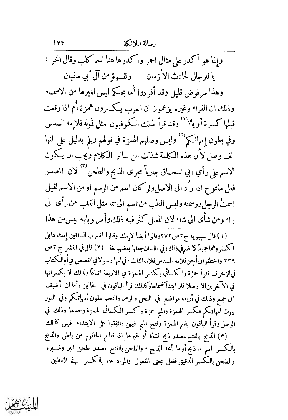 وهذا مرفوض قليل وقد أفردوا أما بحكم ليس لغيرها من الأسماء وذلك ان الفراء وغيره يزعمون ان العرب يكسرون همزة أم اذا وقعت قبلها كسرة أو ياء (¬1) وقد قرأ بذلك الكوفيون مثل قوله فلإمه السدس وفي بطون إمهاتكم (¬2) وليس وصلهم الهمزة في قولهم ويلم بدليل على انها الف وصل لأن هذه الكلمة شذّت عن سائر الكلام ويجب ان يكون الاسم على رأي ابى اسحاق جارياً مجرى الذبح والطحن (¬3) لان المصدر فعل مفتوح اذا رد إلى الاصل ولو كان اسم من الوسم او من الاسم لقيل اسمت الرجل ووسمته وليس القلب من اسم إلى سما مثل القلب من رأى إلى راء ومن شأى إلى شاء لان المعتل كثر فيه ذلك وأمر وبابه ليس من هذا
