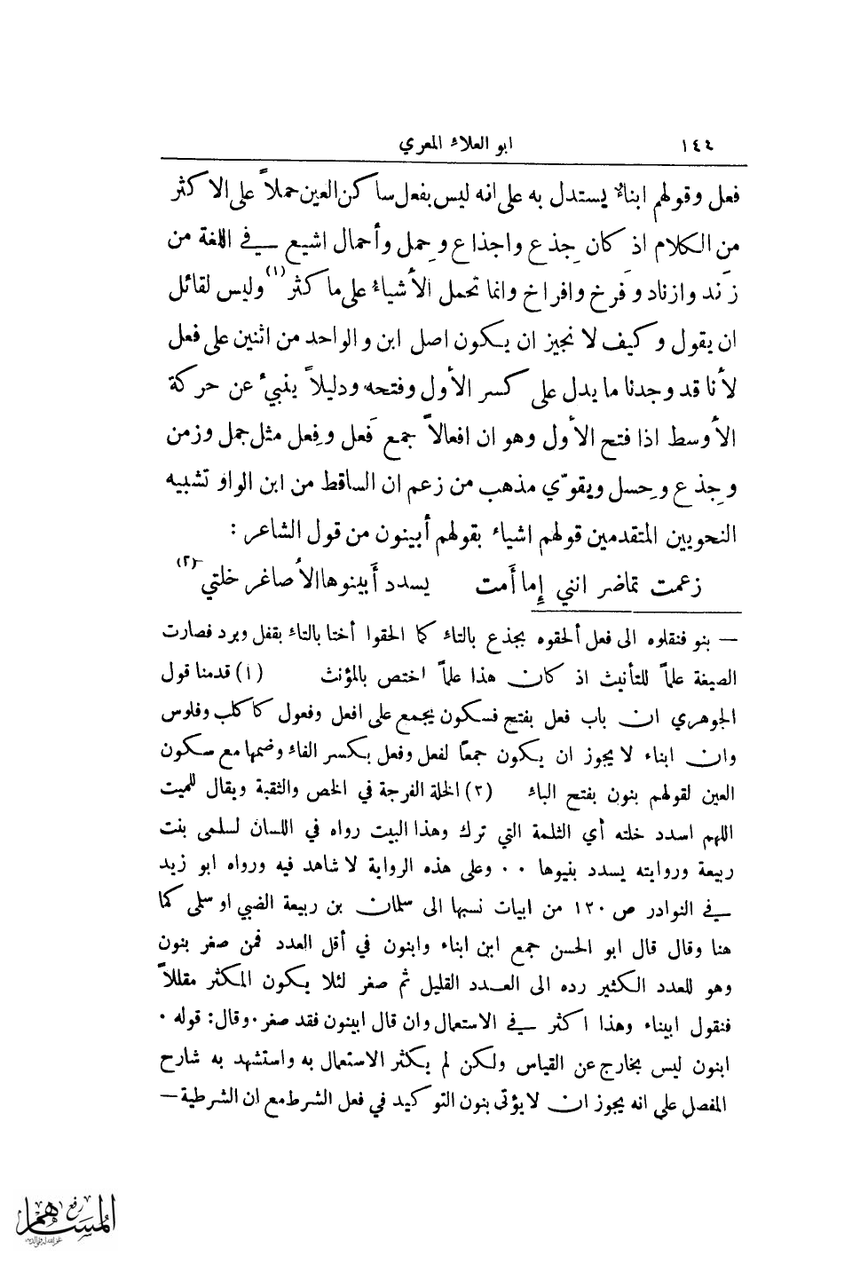 (¬1) قدمنا قول الجوهري ان باب فعل بفتح فسكون يجمع على افعل وفعول كاكلب وفلوس وان ابناء لا يجوز ان يكون جمعًا لفعل وفعل بكسرالفاء وضمها مع سكون العين لقولهم بنون بفتح الباء.