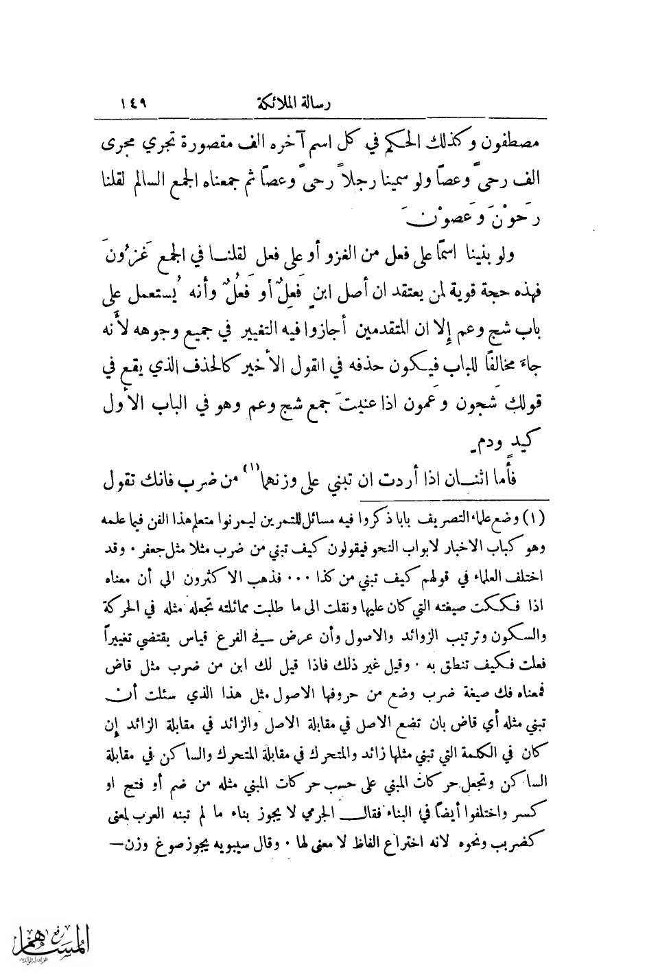مصطفون وكذلك الحكم في كل اسم آخره الف مقصورة تجري مجرى الف رحى وعصا ولو سمينا رجلا رحى وعصا ثم جمعناه الجمع السالم لقلنا رحون وعصون.