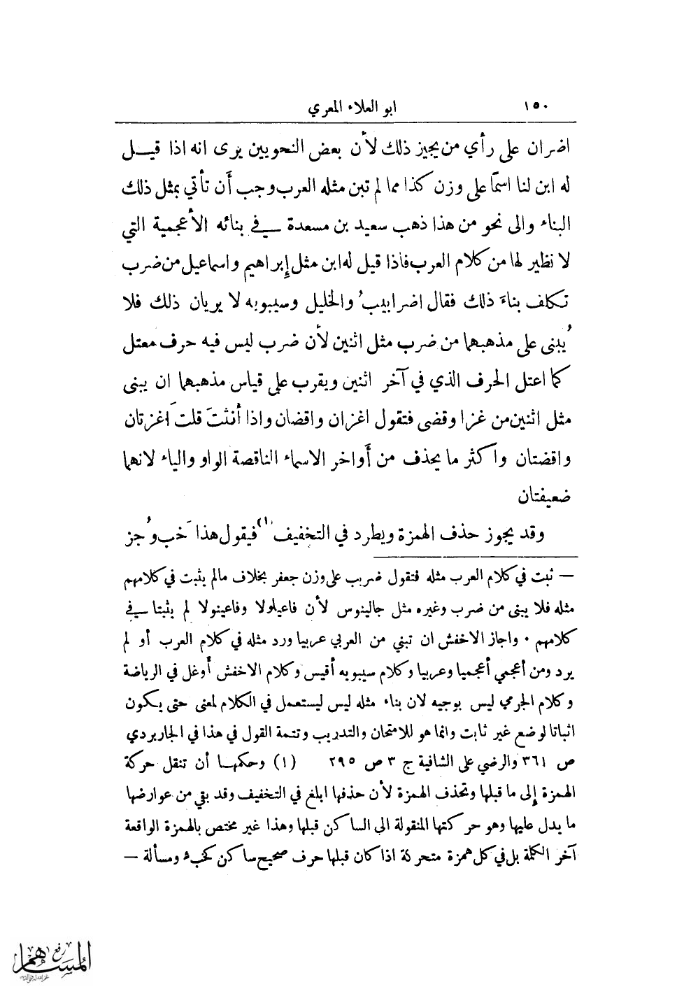 (¬1) وحكمها أن تنقل حركة الهمزة الى ما قبلها وتحذف الهمزة لأن حذفتها ابلغ في التخفيف وقد بقي من عوارضها ما يدل عليها وهو حركتها المنقولة الى الساكن قبلها وهذا غير مختص بالهمزة الواقعة آخر الكلمة بل في كل همزة متحركة إذا كان قبلها حرف صحيح ساكن كخبُّ ومسألة =
