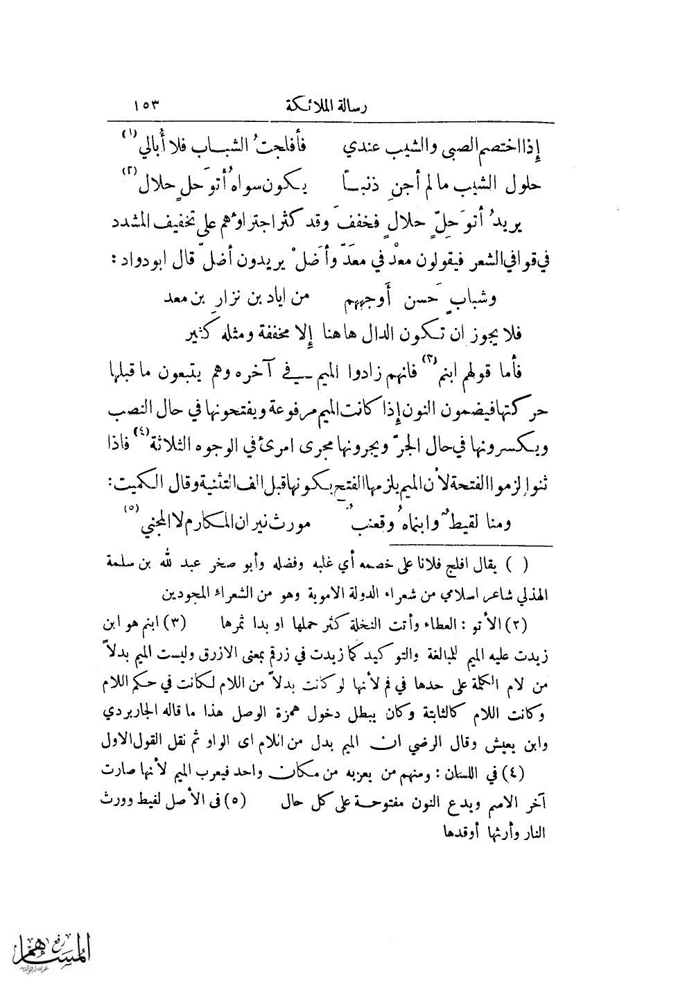 (¬3) ابنم هو ابن زيدت عليه الميم للمبالغة والتوكيد كما زيدت فى زرقم بمعنى الازرق وليست الميم بدلاً من لام الكلمة على حدها في فم لأنها لو كانت بدلاً من اللام لكانت في حكم اللام وكانت اللام كالثابتة وكان يبطل دخول همزة الوصل هذا ما قاله الجاربردي وابن يعيش وقال الرضي أن الميم بدلمن اللام اى الواو ثم نقل القول الاول.