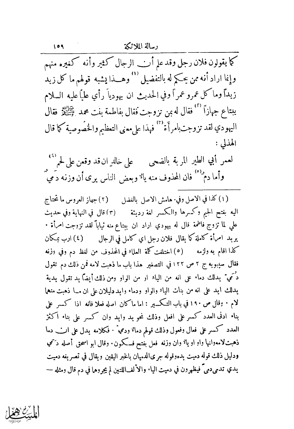 (¬5) اختلفت كلمة العلماء في المحذوف من لفظ دم وفي وزنه فقال سيبويه ج 2 ص 122 في التصغير هذا باب ما ذهبت لامه فمن ذلك دم تقول دمي يدلك دماء على انه من الياء او من الواو ومن ذلك أيضًا يد تقول يديه يدلك ايد على انه من بنات الياء والواو ودماء وايد دليلان على ان ما ذهبت منهما لام. وقال ص 190 في باب التكسير: اما ما كان اصله فعلا فانه اذا كسر على بناء ادنى العدد كسر على افعل وذلك نحو يد وايد وان كسر على بناء اكثر العدد كسر على فعال وفعول وذلك قولهم دماء ودمي. فكلامه يدل على ان دما ذهب لامه وانها واو او ياء وان وزنه فعل بفتح فسكون. وقال ابو اسحق أصله دمي ودليل ذلك قوله دميت يده وقوله جرى الدميان بالخبر اليقين ويقال في تصريفه دميت يدي تدمى دمى فيظهرون في دميت الياء والألف اللتين لم يجروهما في دم قال ومثله -