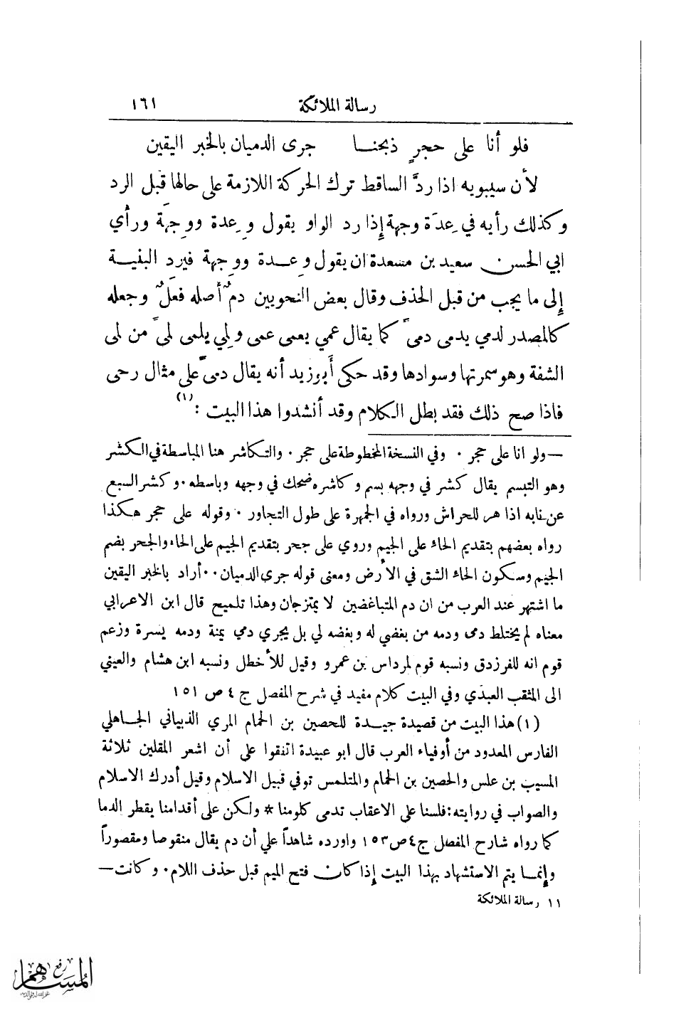 = ولو أنا على حجر. وفي النسخة المخطوطة على حجر. والتكاشر هنا المباسطة في الكشر وهو التبسم يقال كشر في وجهه بسم وكاشره ضحك في وجهه وباسطه. وكشر السبع عن نابه اذا حر للحراش ورواه في الجمهرة على طول التجاور. وقوله على حجر هكذا رواه بعضهم بتقديم الحاء على الجيم وروي على جحر بتقديم الجيم على الحاء والجحر بضم الجيم وسكون الحاء الشق في الأرض ومعنى قوله جرى الدميان .. أراد بالخبر اليقين ما اشتهر عند العرب من ان دم المتباغضين لا يمتزجان وهذا تلميح قال ابن الاعرابي معناه لم يختلط دمى ودمه من بغضي له وبغضه لي بل يجري دمي يمنة ودمه يسرة وزعم قوم انه للفرزدق ونسبه قوم لمرداس بن عمرو وقيل للأخطل ونسبه ابن هشام والعيني الى المثقب العبدي وفي البيت كلام مفيد في شرح المفصل ج 4 ص 151.