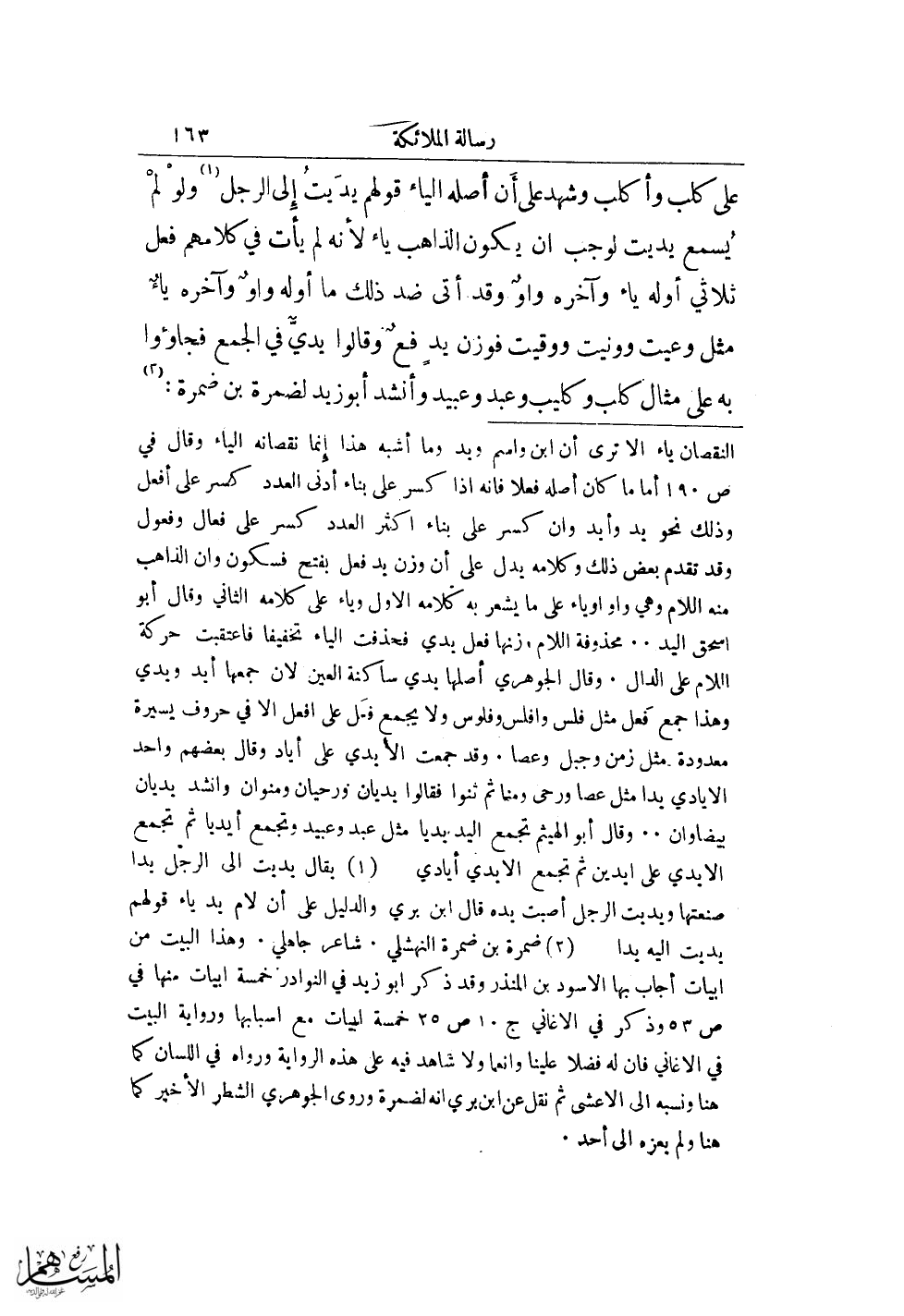 = النقصان ياء ألا ترى أن ابن واسم ويد وما أشبه هذا إنما نقصانه الياء وقال في ص 190 أماما كان أصله فعلا فانه اذا كسر على بناء أدنى العدد كسر على افعل وذلك نحو يد وأيد وان كسر على بناء اكثر العدد كسر على فعال وفعول وقد تقدم بعض ذلك وكلامه يدل على أن وزن يد فعل بفتح فسكون وان الذاهب منه اللام وهي واو او ياء على ما يشعر به كلامه الاول وياء على كلامه الثاني وقال أبو اسحق اليد .. محذوفة اللام. زنها فعل يدي فحذفت الياء تحفيفا فاعتقبت حركة اللام على الدال. وقال الجوهري أصلها يدي ساكنة العين لان جمعها أيد ويدي وهذا جمع فعل مثل فلس وافلس وفلوس ولا يجمع فعل على افعل الا في حروف يسيرة معدودة مثل زمن وجبل وعصا. وقد جمعت الايدي عللى اياد وقال بعضهم واحد الايادي يدا مثل عصا ورحى ومنا ثم ثنوا فقالوا يديان وروحيان ومنوان وانشد يديان بيضاوان ..... وقال أبو الهيثم تجمع اليد يديا مثل عبد وعبيد وتجمع أيديا ثم تجمع الايدي على ايدين ثم تجمع الايدي أيادي