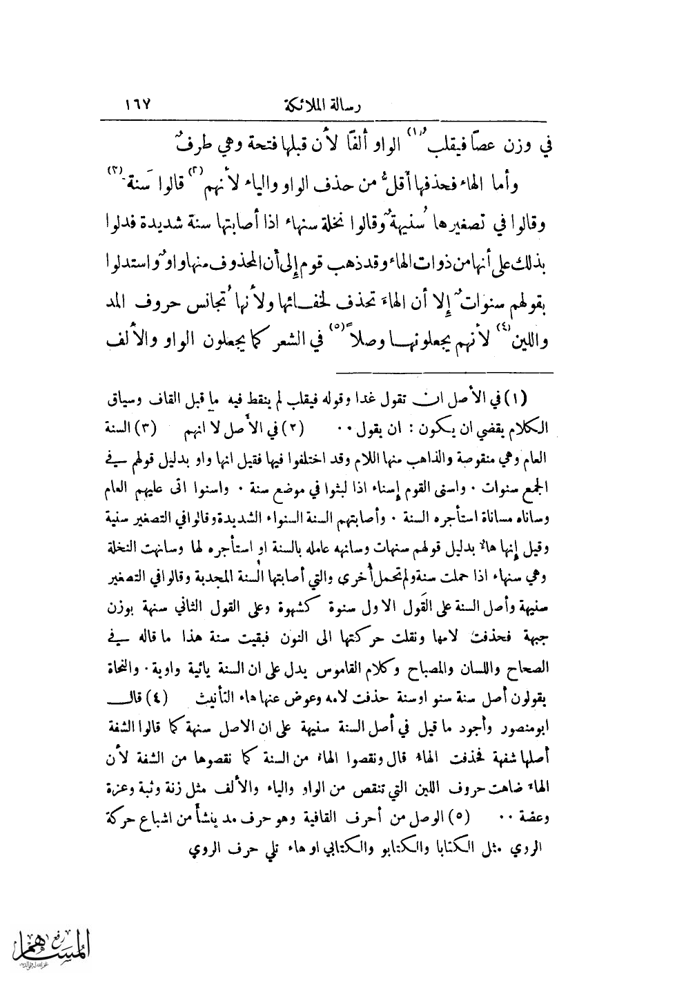 (¬3) السنة العام وهي منقوصة والذاهب منها اللام وقد اختلفوا فيها فقيل انها واو بدليل قولهم في الجمع سنوات. واسنى القوم إسناء اذا لبثوا في موضع سنة. واسنوا اتى عليهم العام وساناه مساناة استأجره السنة. وأصابتهم السنة السنواء الشديدة وقالوا في التصغير سنية وقيل إنها هاء بدليل قولهم سنهات وسانهه عامله بالسنة او استأجره لها وسانهت النخلة وهي سنهاء اذا حملت سنة ولم تحمل أخرى والتي أصابتها السنة المجدية وقالوا في التصغير سنيهة وأصل السنة على القول الأول سنوة كشهوة وعلى القول الثاني سنهة بوزن جبهة فحذفت لامها ونقلت حركتها الى النون فبقيت سنة هذا ما قاله في الصحاح واللسان والمصباح وكلام القاموس يدل على ان السنة يائية واوية. والنحاة يقولون أصل سنة سنو او سنة حذفت لامه وعوض عنها هاء التأنيث