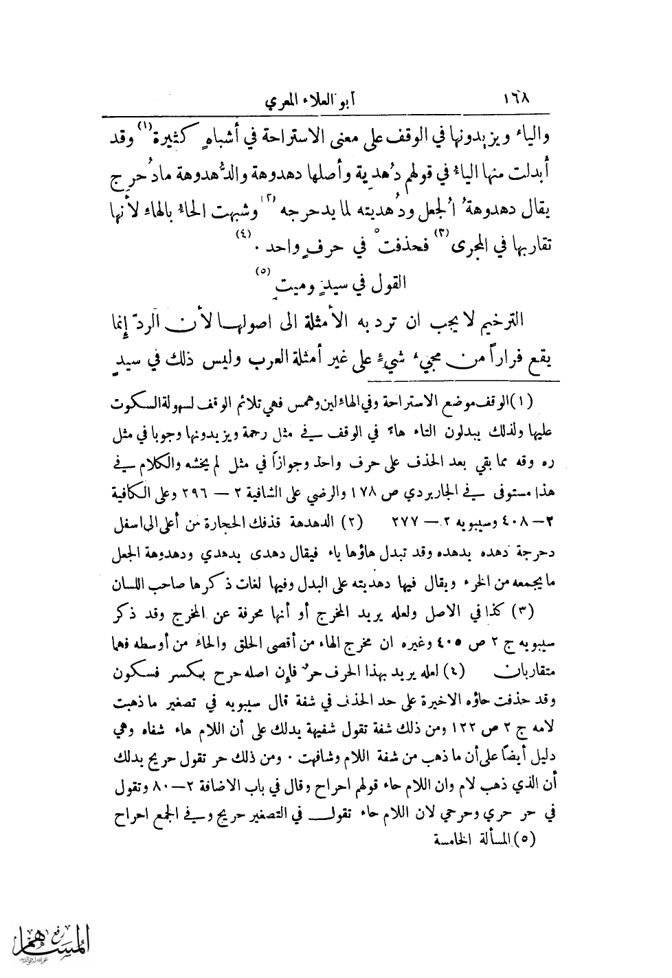 (¬4) لعله يريد بهذا الحرف حٌر فإن اصله حرح بكسر فسكون وقد حذفت حاؤه الاخيرة على حد الحذف في شفة قال سيبويه في تصغير ما ذهب لامه ج 2 ص 122 ومن ذلك شفة تقول شفيهة يدلك على أن اللام هاء شفاه وهي دليل أيضًا على ان ما ذهب من شفة اللام وشافهت. ومن ذلك حر تقول حريح يدلك أن الذي ذهب لام وان اللام حاء قولهم احراح وقال في باب الاضافة 2 - 80 وتقول في حر حري وحرحي لان اللام حاء تقول في التصغير حريح وفي الجمع احراح