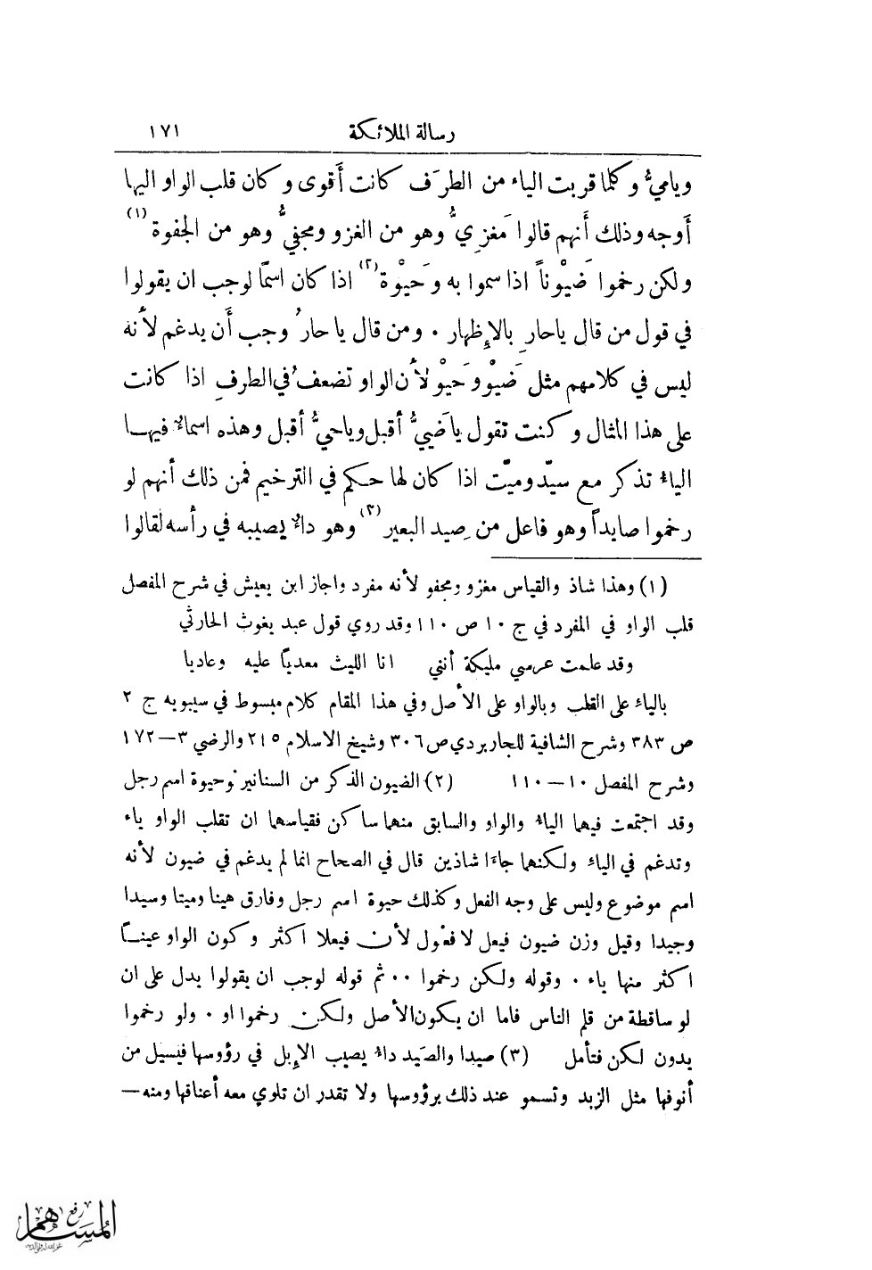 (¬2) الضيمون الذكر من السنانير وحيوة اسم رجل وقد اجتمعت فيهما الياء والواو والسابق منهما ساكن فقياسهما ان تقلب الواو ياء وتدغم في الياء ولكنهما جاءا شاذين قال في الصحاح انما لم يدغم في ضيون لأنه اسم موضوع وليس على وجه الفعل وكذلك حيوة اسم رجل وفارق هينا وميتا وسيدا وجيدا وقيل وزن ضيون فيعلى لا فعول لأن فيعلان اكثر وكون الواو عيناً اكثر منها ياء .. وقوله ولكن رخموا ... ثم قوله لوجب ان يقولوا يدل على ان لو ساقطة من قلم الناس فاما ان يكون الأصل ولكن رخموا او .. ولو رخموا بدون لكن فتأمل