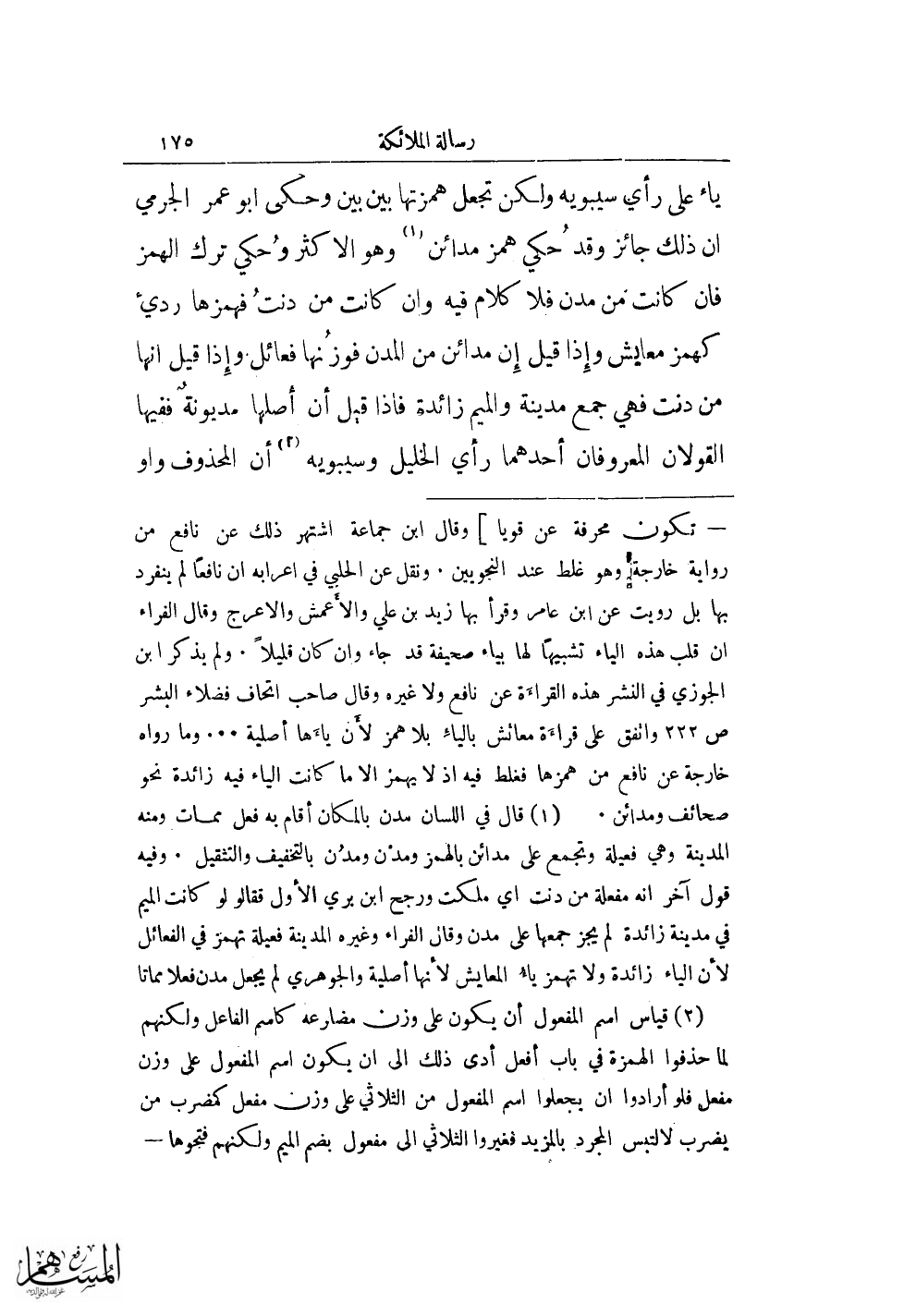 ياء على رأي سيبويه ولكن تجعل همزتها بين بين وحكى ابو عمر الجرمي ان ذلك جائ وقد حكي همز مدائن (¬1) وهو الاكثر وحكي ترك الهمز فان كانت من مدن فلا كلام فيه وان كانت من دنت فهمزها ردئ كهمز معايش وإذا قيل إن مدائن من المدن فوزنها فعائل وإذا قيل انها من دنت فهي جمع مدينة والميم زائدة فاذا قيل أن أصلها مديونةٌ ففيها القولان المعروفان أحدهما رأي الخليل وسيويه (¬2) أن المحذوف واو