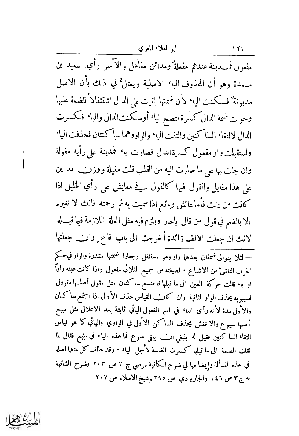 = لئلا يتوالى ضمتان بعدهما واو وهو مستثل وجعلوا ضمتها مقدرة والواو في حكم الحرف الناشئ من الاشباع. فصيغته من جميع الثلاثي مفعول واذا كانت عينه واوًا او ياء نفلت حركة العين الى ما قبلها فاجتمع ساكنان مثل مقول أصلها مقوول فسيويه يحذف الواو الثانية وان كان القياس حذف الأولى اذا اجتمع ساكنان والأول مدة لأنه رأى الياء في اسم المفعول اليائي ثابتة بعد الاعلال مثل مبيع أصلها مبيوع والاخفش يحذف الساكن الأول في الواوي واليائي كما هو قياس التقاء الساكنين فقيل له ينبغي ان يبقى مبوع فما هذه الياء في مبيع فقال لما نقلت الضمة الى ما قبلها كسرت الضمة لأجل الياء. وقد خالف كل منهما اصله في هذه المسألة وإيضاحها في شرح الكافية للرضي ج 2 ص 203 وشرح الشافية له ح 3 ص 146 والجاربردي ص 295 وشيخ الاسلام ص 207