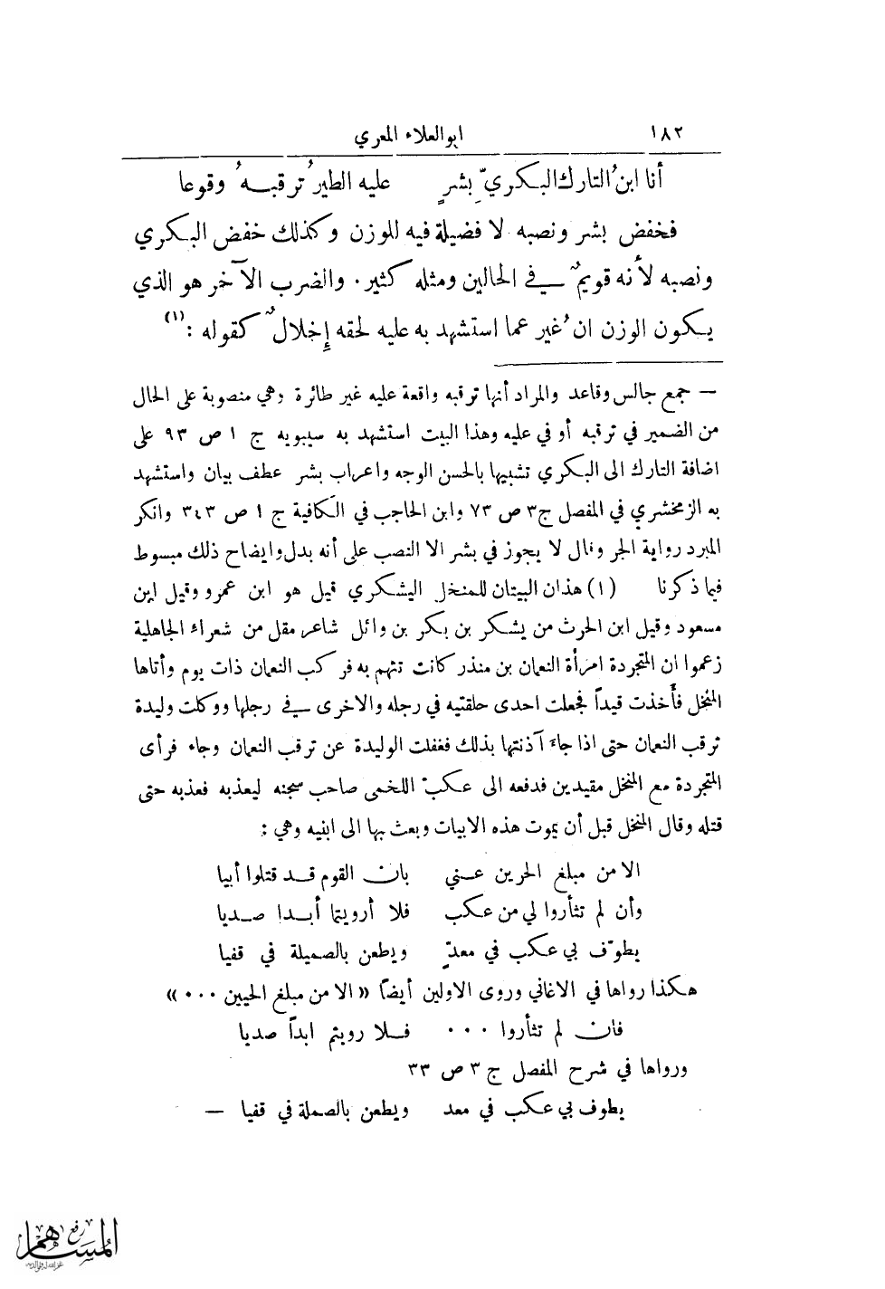 فخفض بشر ونصبه لا فضيلة فيه للوزن وكذلك خفض البكري ونصبه لأنه قويمٌ في الحالين ومثله كثير. والضرب الآخر هو الذي يكون الوزن ان غير عما استشهد به عليه لحقه إخلالٌ كقوله: (¬1)
