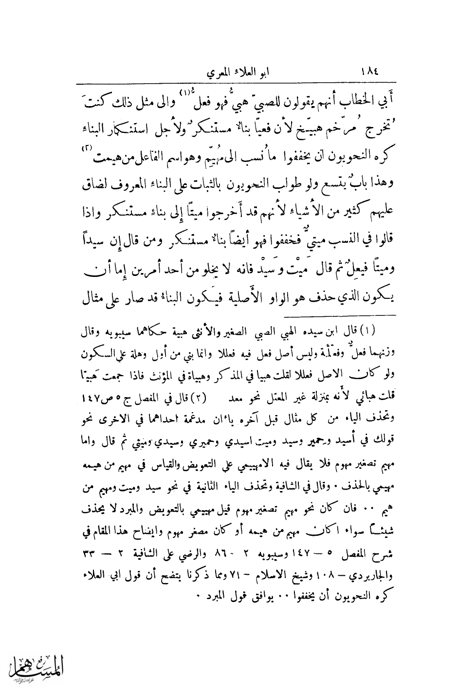 (¬2) قال فى المفصل ج 5 ص 147 وتحذف الياء من كل مثال قبل آخره ياءان مدغمة احدهما فى الأخرى نحو قولك فى أسيد وحمير وسيد وميت اسيدي وحميري وسيدي وميثي ثم قال وأما مهيم تصغير مهوم فلا يقال فيه الامهييمي على التعويض والقياس فى مهيم من هيمه مهيمي بالحذف. وقال في الشافية وتحذف الياء الثانية فى نحو سيد وميت ومهيم من هيم .. فإن كان نحو مهيم تصغير مهوم قيل مهييمي بالتعويض والمبرد لا يحذف شيئًا سواء أكان مهيم من هيمه أو كان مصغر مهوم وإيضاح هذا المقام فى شرح المفصل 5 - 147 وسيبويه 2 - 86 والرضي على الشافية 2 - 33 والجابردي -108 وشيخ الإسلام -71 ومما ذكرنا يتضح أن قول أبي العلاء كره النحويون أن يخففوا .. يوافق قول المبرد.