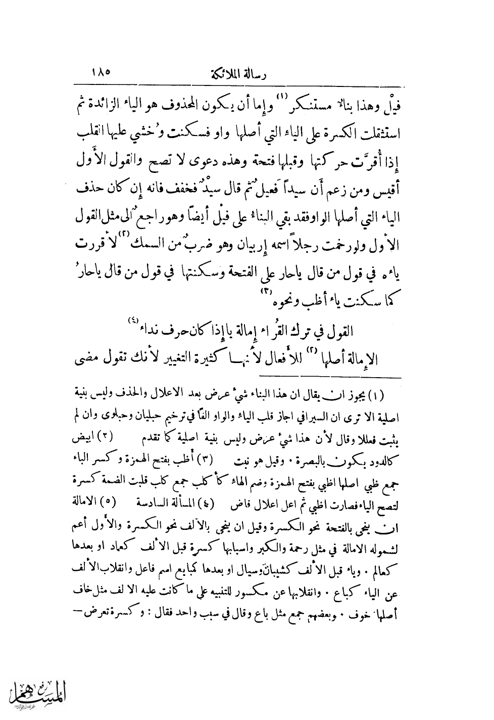 (¬1) يجوز أن يقال ان هذا البناء شيء عرض بعد الإعلال والحذف وليس بنية اصلية الا ترى ان السيرافي اجاز قلب الياء والواو الفًا فى ترخيم حبليان وحبلوى وان لم يثبت فعللا وقال لأن هذا شيء عرض وليس بنية اصلية كما تقدم.